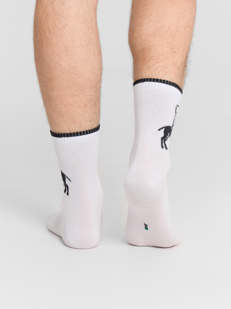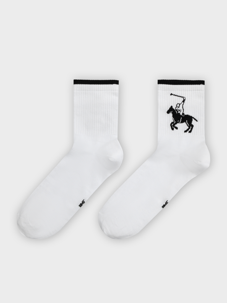 Рис.3107. Мужские носки, средней длины с резинкой на поголенке и рисунком в виде всадника на лошади и цветной полоской на бортике.