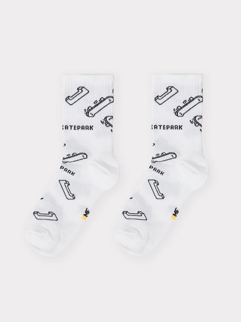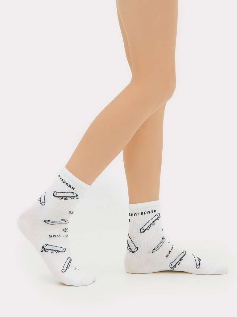 Детские носки из высококачественного хлопка с высоким плотным бортом и рисунком в виде скейтбордов. Натуральные волокна отлично пропускают воздух и впитывают влагу, дарят ощущение комфорта в течение дня. Благодаря небольшому количеству эластана в составе, высокие детские носки удобно сидят и не сползают, хорошо тянутся и легко надеваются. Пятка и мысок дополнительно укреплены для защиты от протирания. Резинка мягко, но надежно удерживает носки, не оставляя на коже следов. В ассортименте Mark Formelle можно выбрать самые разнообразные дизайны и расцветки: однотонные зеленые, желтые, синие или серые детские носки подойдут и для мальчика, и для девочек, найдутся модели в полоску, с оригинальными авторскими рисунками, орнаментами, а также базовые носки белые и черные детские. Маленьким модникам точно понравятся!