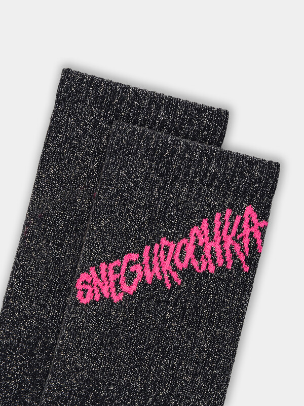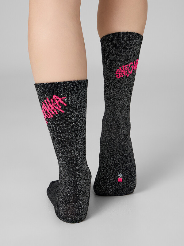 рис.3437 Женские носки высокие с плотным бортом и рисунком в виде надписи "SNEGUROCHKA" с использованием люрекса в основу.