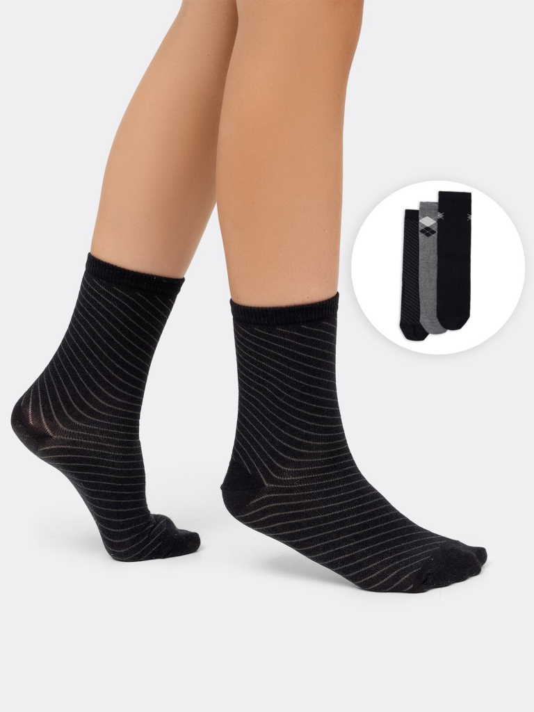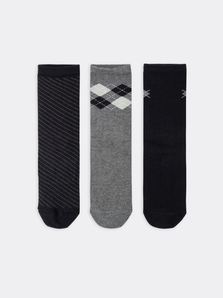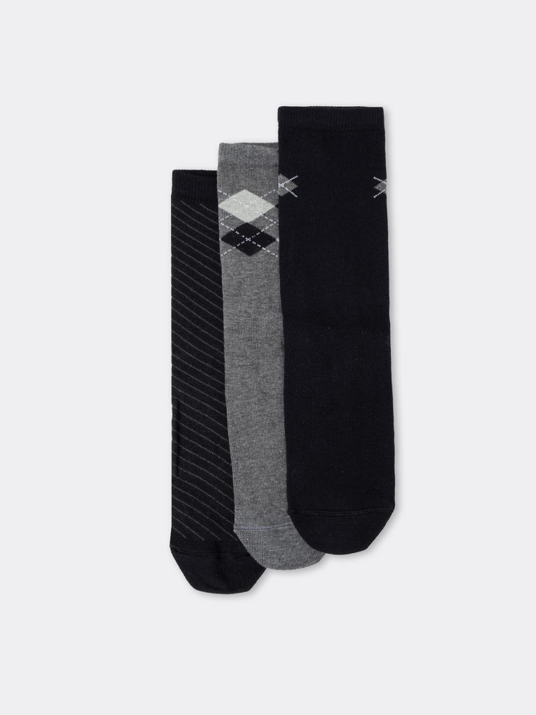 Носки детские мультипак (3 шт.) из высококачественного хлопка с с рисунком в виде ромбов и диагональной полоски. Натуральные волокна отлично пропускают воздух и впитывают влагу, дарят ощущение комфорта в течение дня. Благодаря небольшому количеству эластана в составе, носки удобно сидят на ножке и не сползают, хорошо тянутся и легко надеваются. Пятка и мысок дополнительно укреплены для защиты от протирания. Резинка мягко, но надежно удерживает носки, не оставляя на коже следов. Эти носки точно понравятся вашей маленьким модникам и модницам. Рекомендуем!