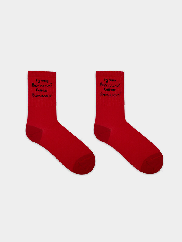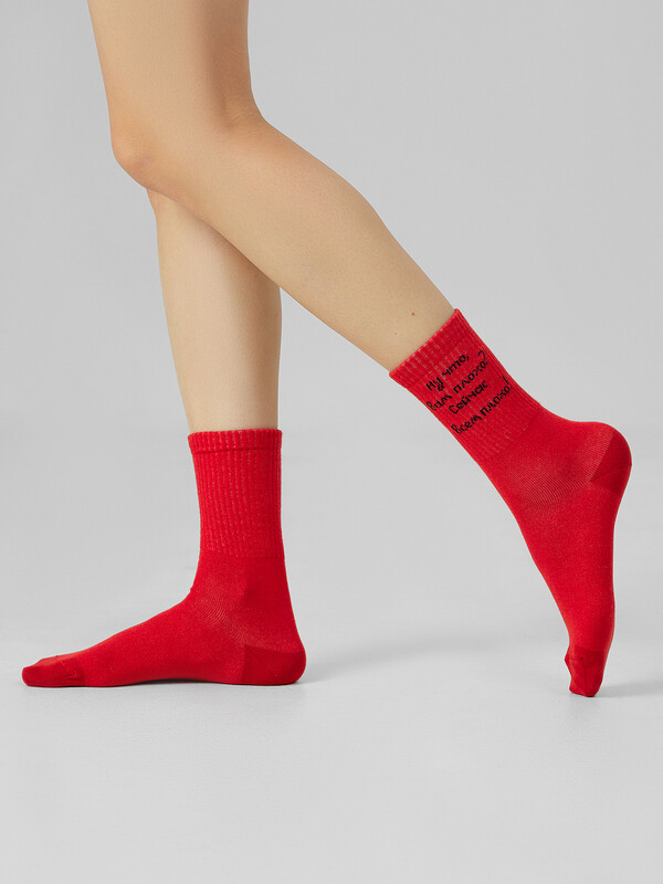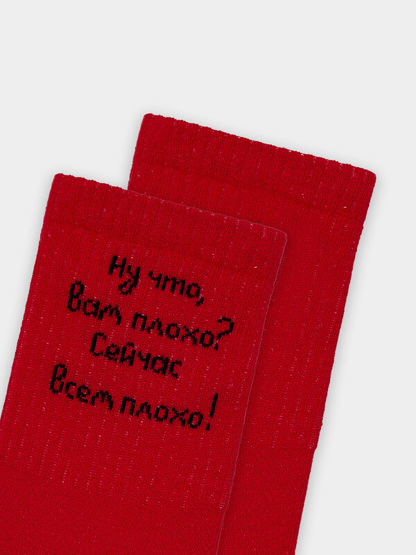 рис.3324 Женские носки высокие с плотным бортом и рисунком в виде надписи "Ну что, вам плохо? Сейчас всем плохо!" на участке резинки.