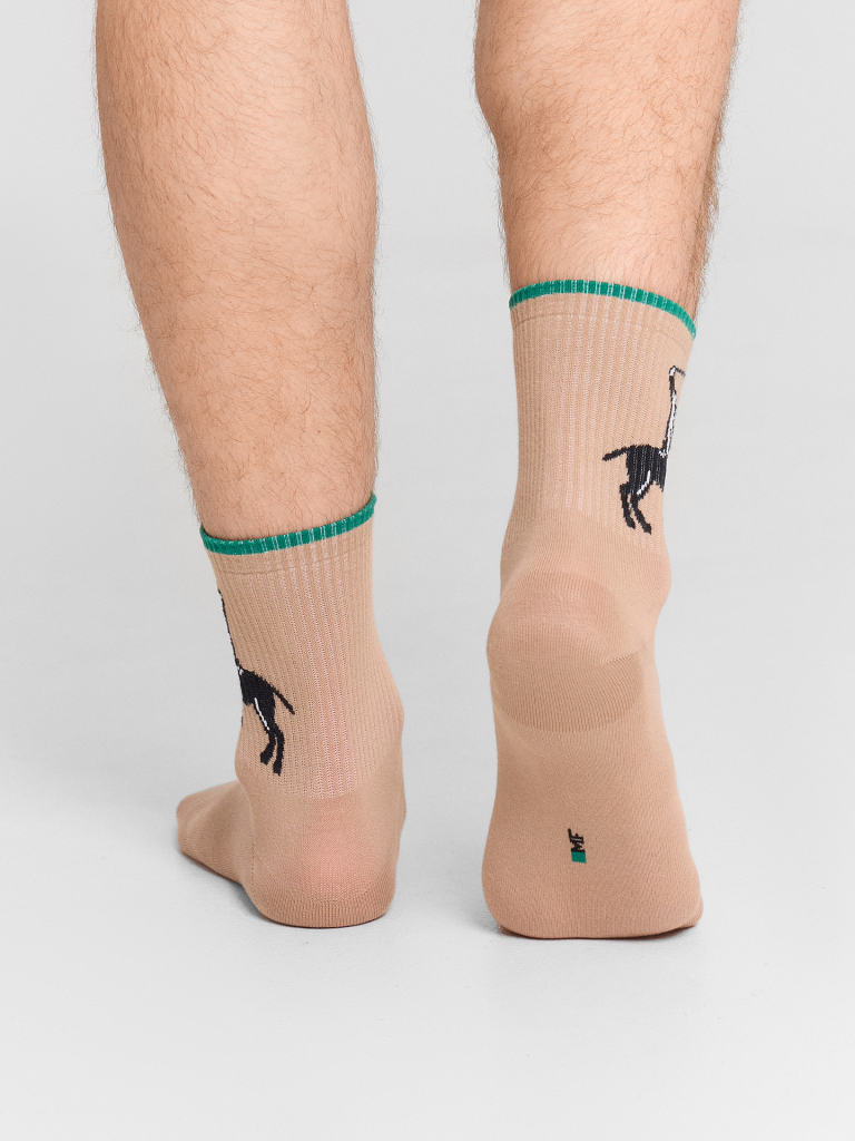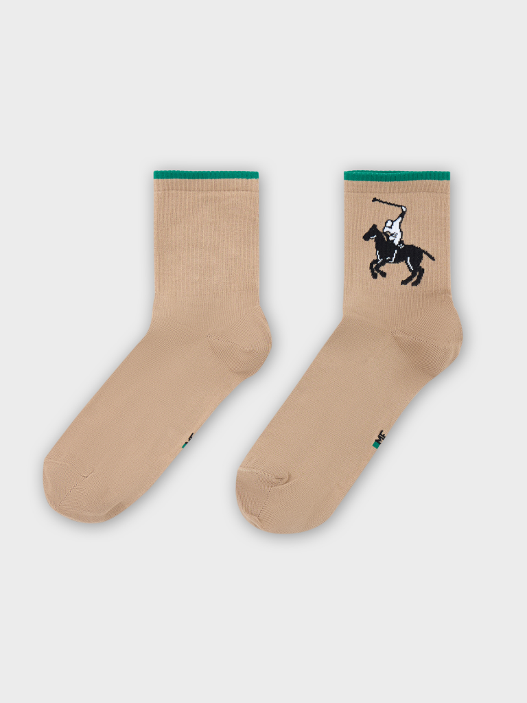 Рис.3107. Мужские носки, средней длины с резинкой на поголенке и рисунком в виде всадника на лошади и цветной полоской на бортике.