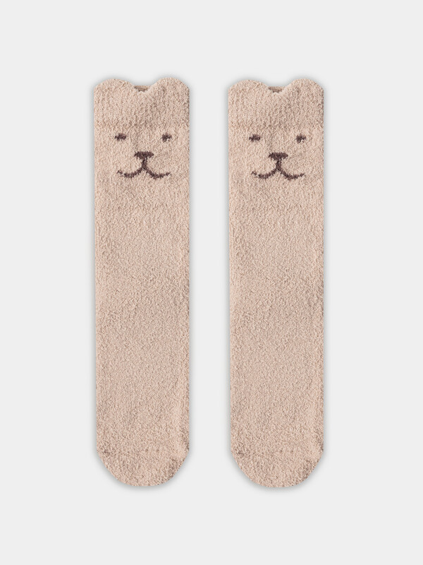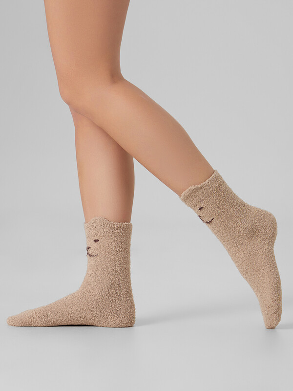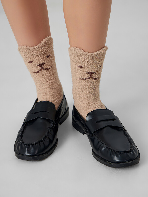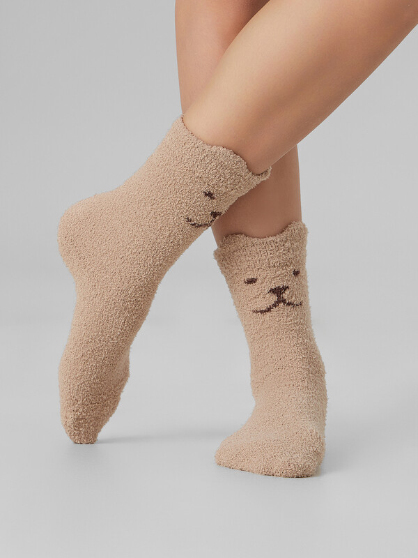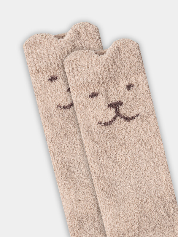 рис.3359 Женские, высокие носки, из каракулевой пряжи с рисунком в виде морды медведя и 3D рисунком на борту.