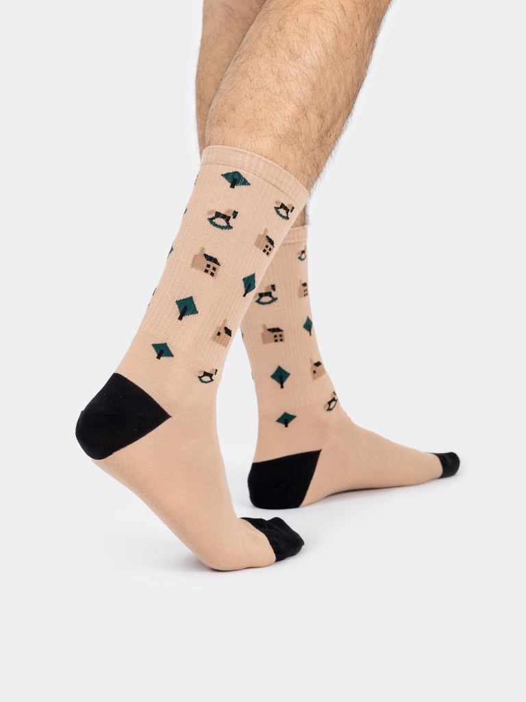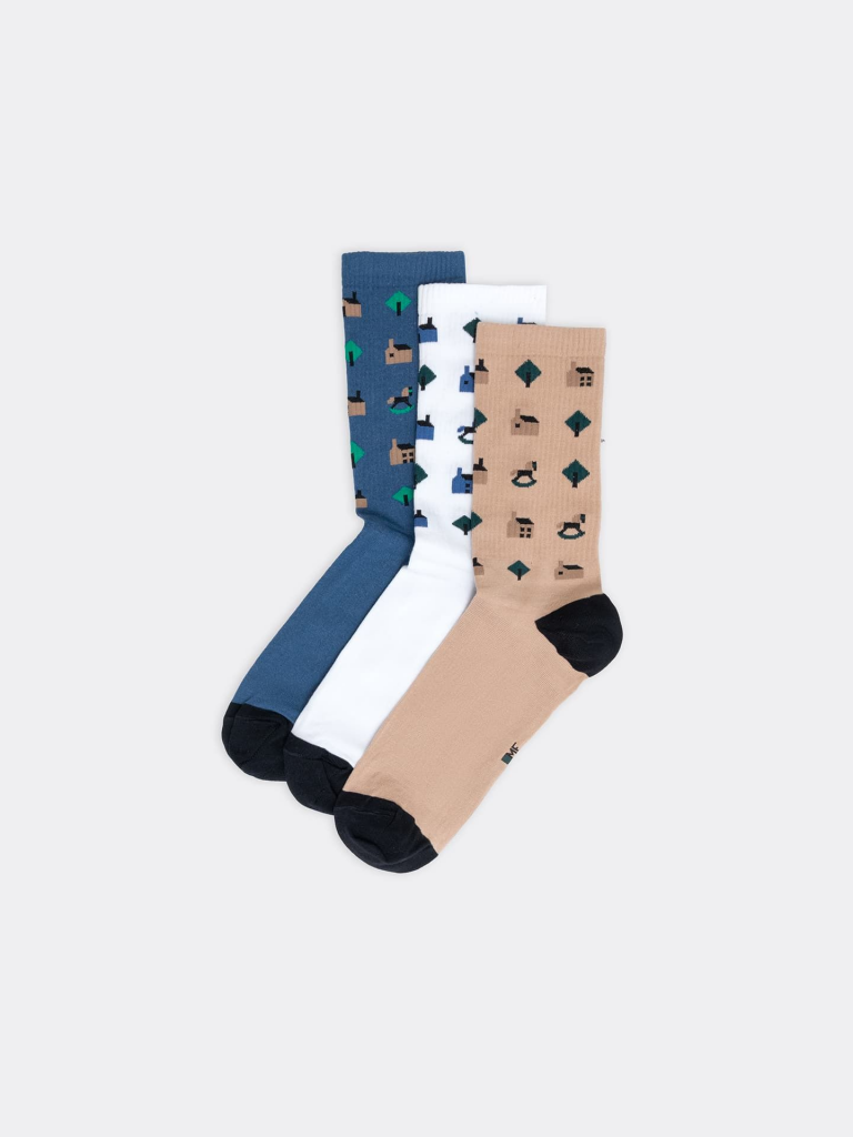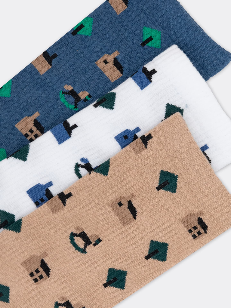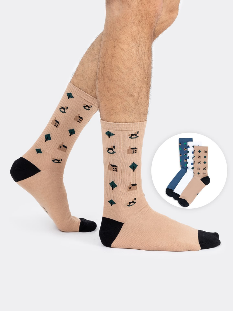 Мультипак их трех пар классических высоких мужских носков с плотным бортом и рисунком в виде деревьев, домов и лошадок. Плотные, качественные и комфортные носки из высококачественного хлопка, который отлично впитывает влагу, пропускает воздух и подходит даже для самой чувствительной кожи. Удобная резинка и плоские швы на мыске носка создают особый комфорт. Прекрасно переносят множественные стирки, сохраняют форму и цвет, устойчивы к изнашиванию. Идеально облегают ногу. Носки мужские от Mark Formelle подходят для ежедневной носки, отлично сочетаются с вещами в гардеробе, дополнят любой образ: классический, спортивный, деловой. Такой набор мужских носков удачный и практичный подарок любимому мужчине, папе, парню или просто другу на любой праздник. Купить носки мужские недорого можно прямо у нас на сайте или в магазине. Красиво, стильно и удобно. Рекомендуем!