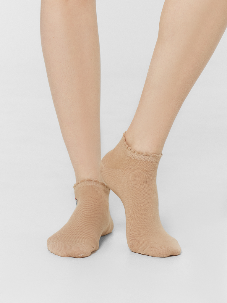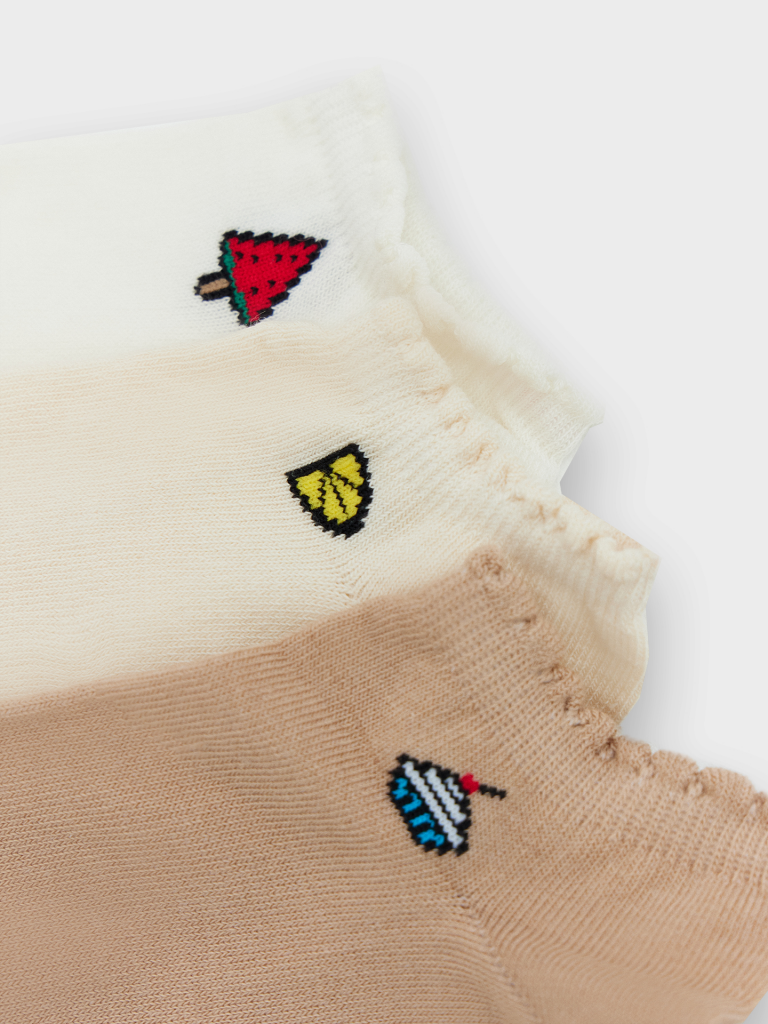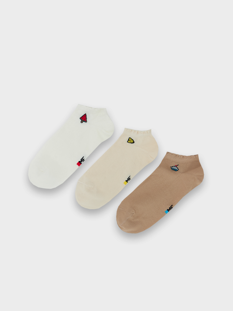 рис.1982 Мультипак из трех пар женских носков укороченных c пикотом на борту и рисунками в виде пироженки, дольки лимона и арбузика.