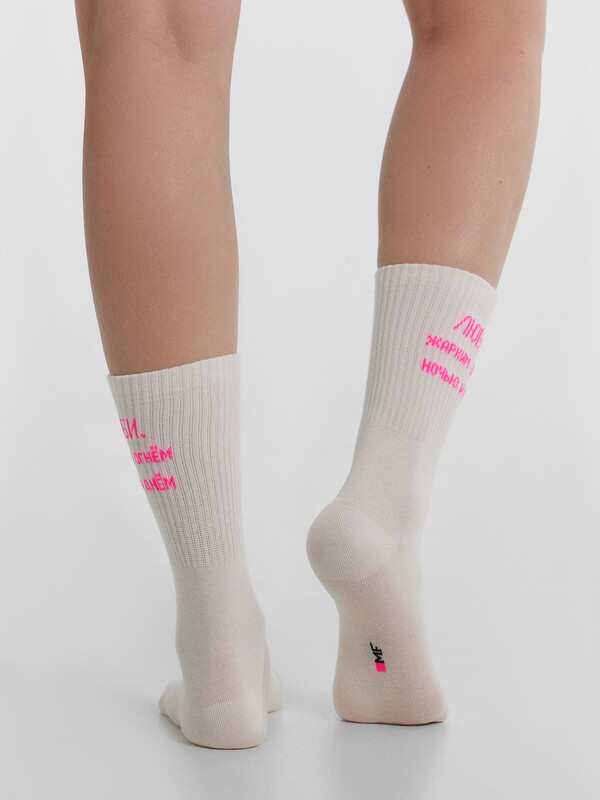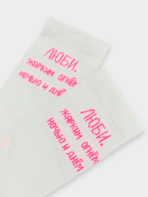 Эти высокие женские носки с надписью "ЛЮБИ...жарким огнем, ночью и днем" станут стильным и романтичным дополнением вашего гардероба. Мягкий и дышащий материал обеспечивает комфорт при носке, а оригинальная надпись добавляет индивидуальности и оригинальности образу. Такие носочки отлично подойдут как для повседневного ношения, так и для создания ярких и запоминающихся образов.