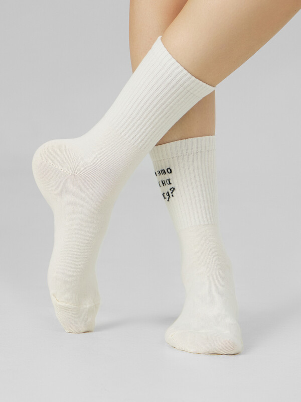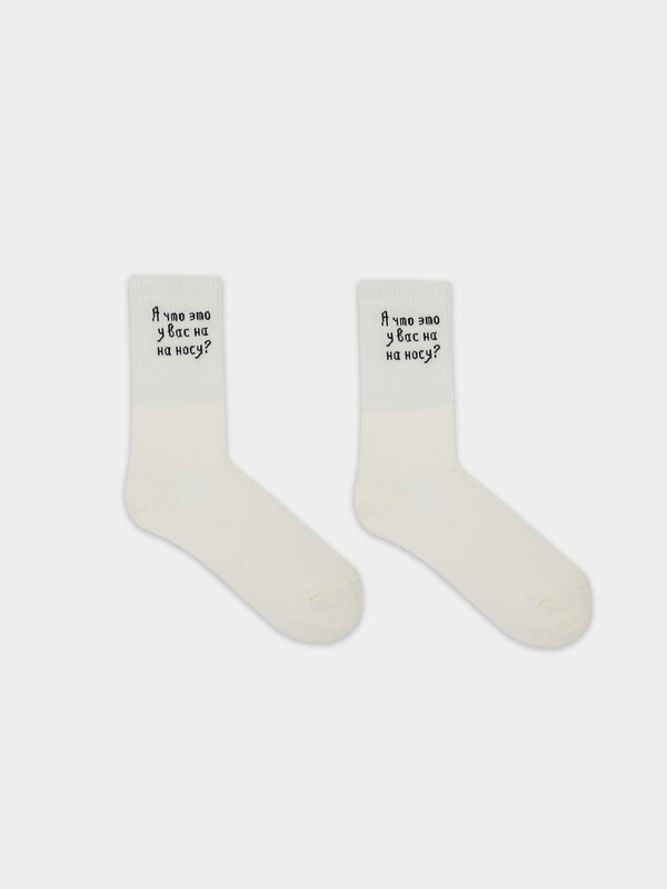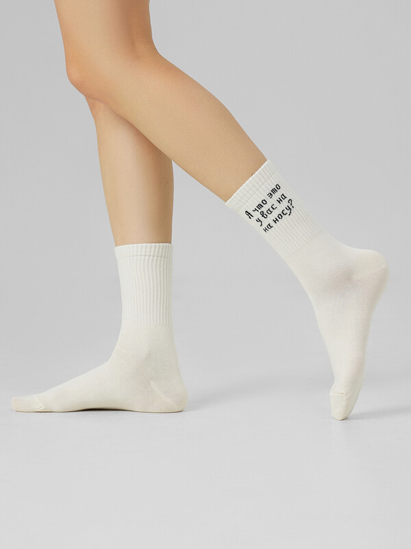 рис.3331 Женские носки высокие с плотным бортом и рисунком в виде надписи "А что это у вас на носу?" на участке резинки.