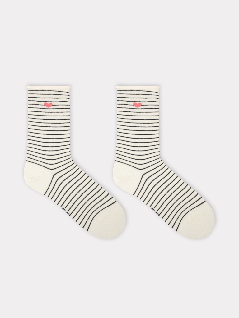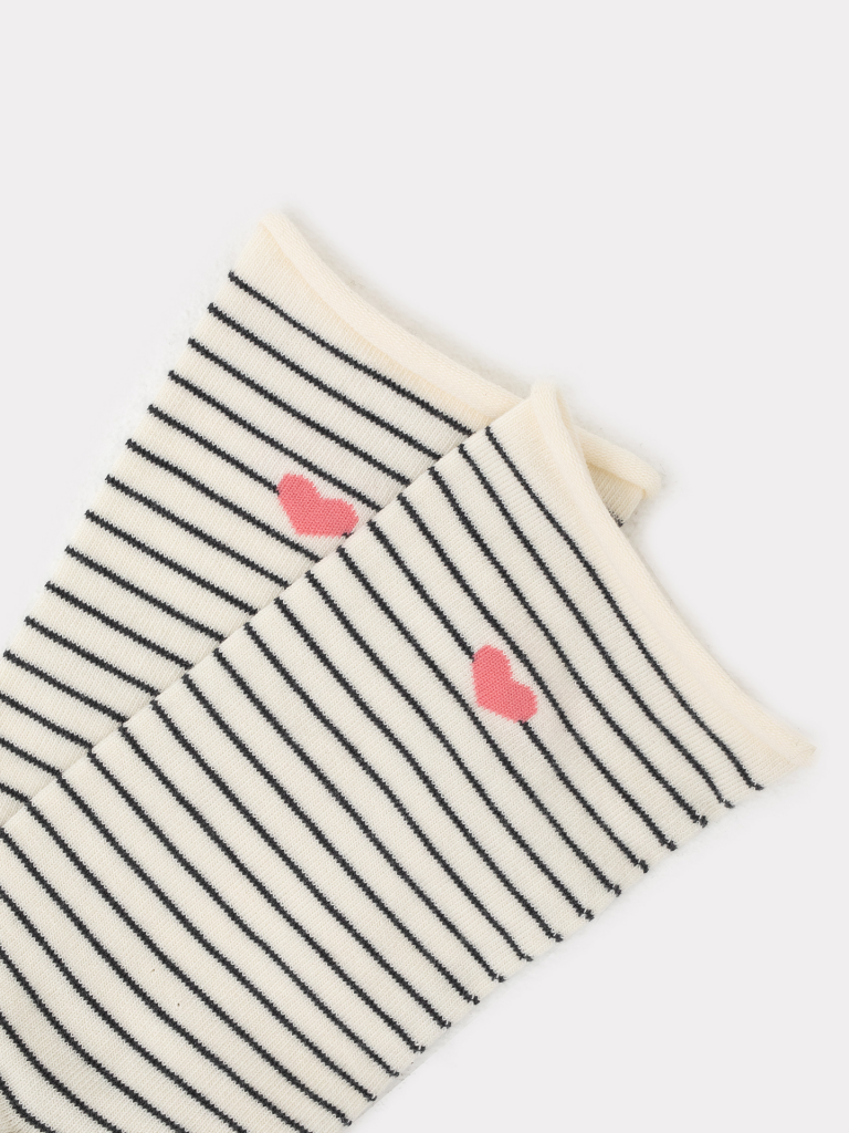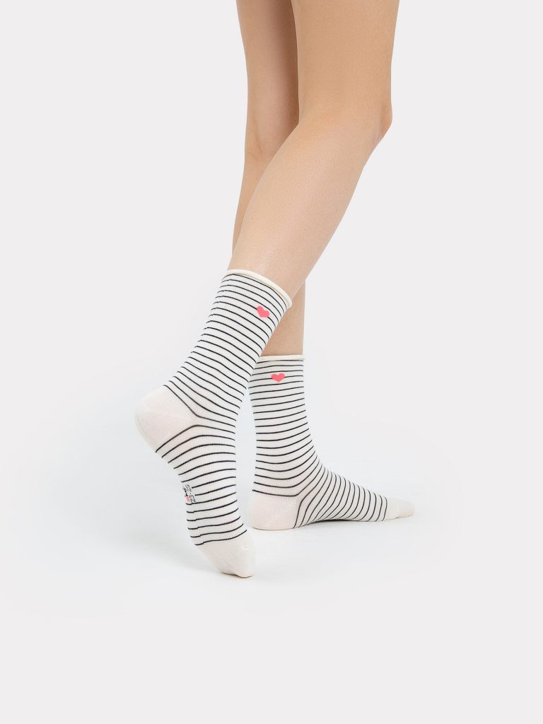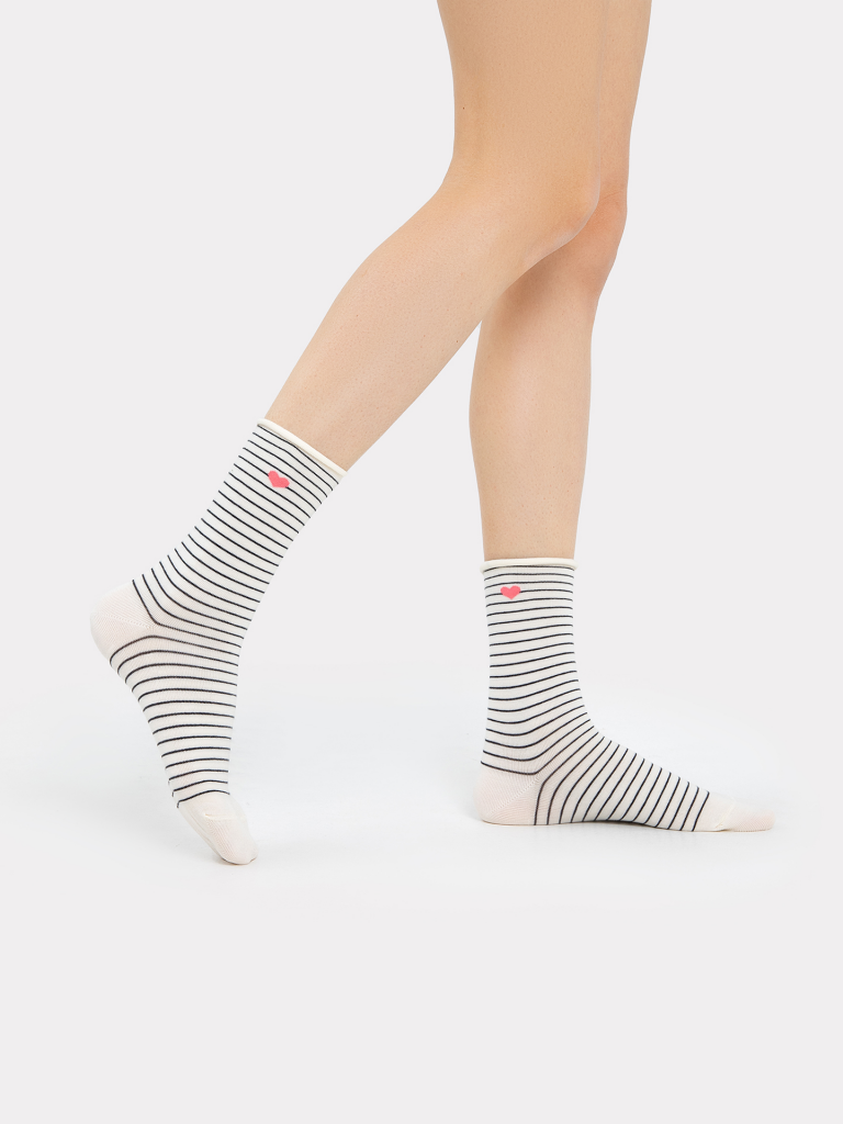 Высокие классические носки женские без борта, с рисунком в виде сердца и полоски. Выполнены из высококачественного гребенного хлопка - тонкого, прочного и эластичного. Натуральные волокна отлично пропускают воздух и впитывают влагу, обеспечивают ощущение комфорта в течение дня. Благодаря небольшому количеству эластана в составе, носочки хорошо облегают и сохраняют форму, практичны и долговечны. Пятка и мысок дополнительно усилены для защиты от протирания при активном движении. Не передавливают ноги и не оставляют на коже следов. Отличный вариант для круглогодичного использования. Мягкие и комфортные. Порадуйте себя и своих близких прекрасными носочками от Mark Formelle!