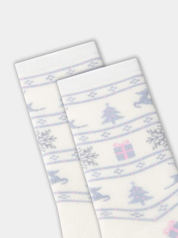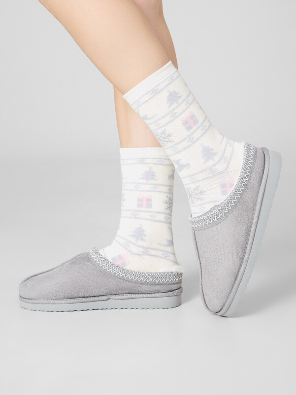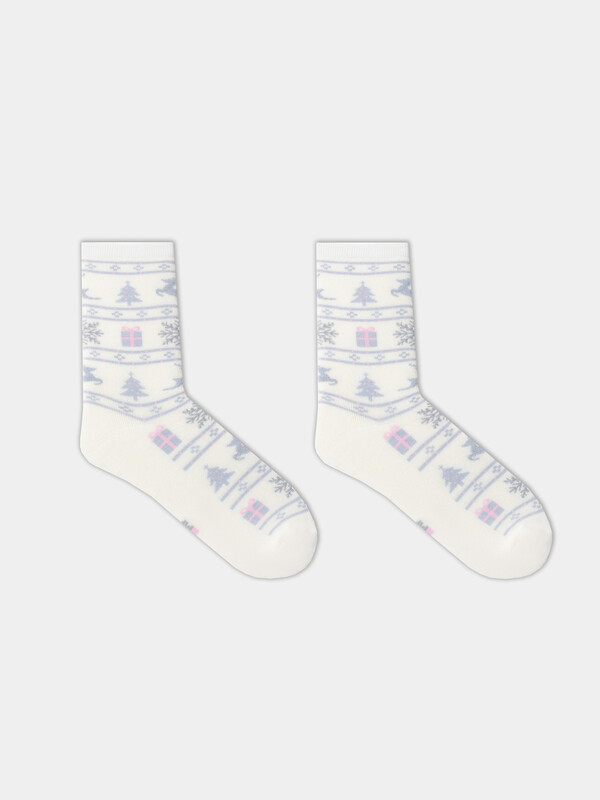 рис.1792 Женские махровые классические носки с рисунком в виде оленей, подарков и елочек.