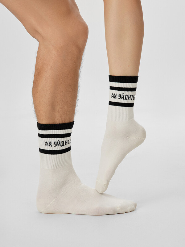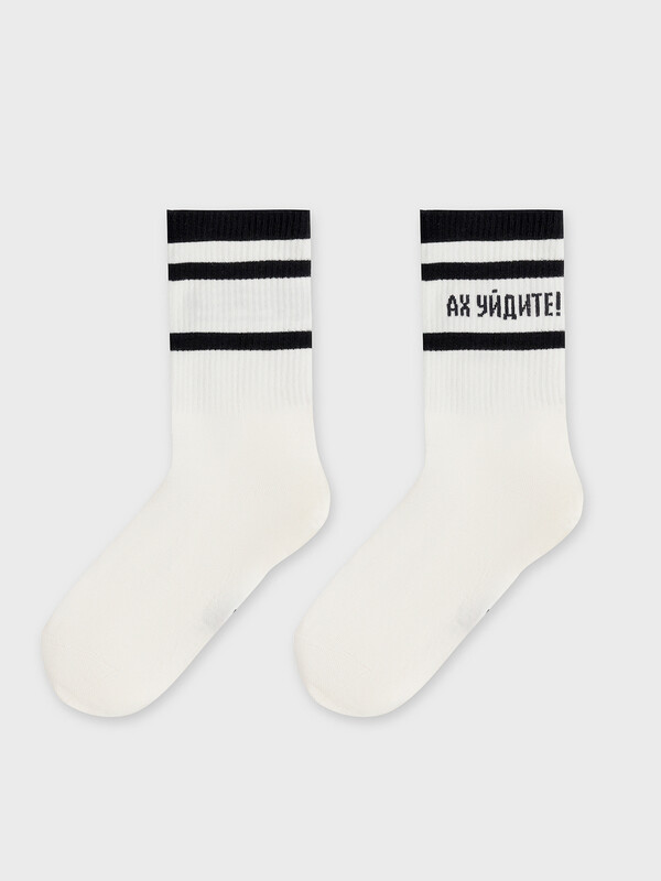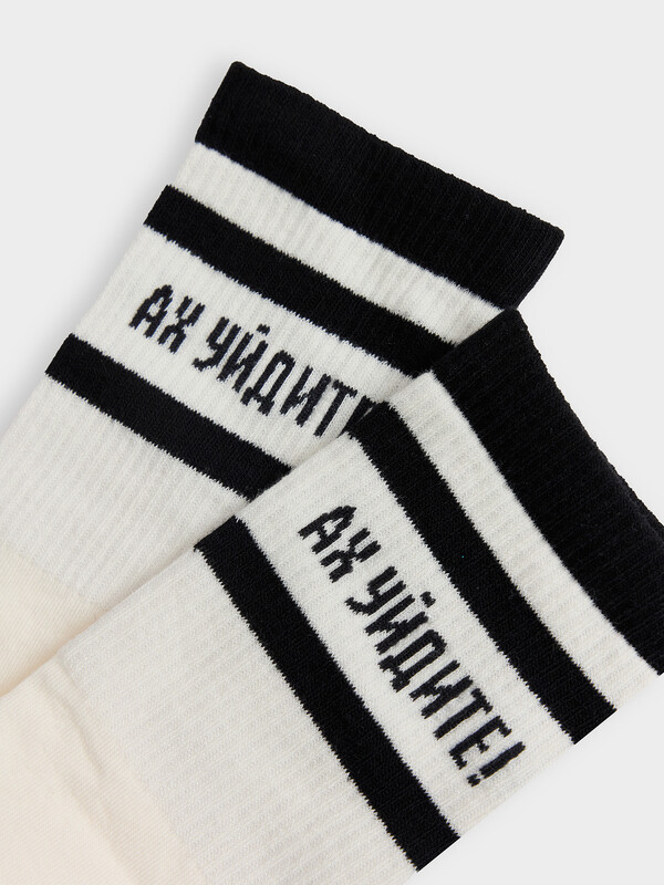 рис.3239 Носок высокий с плотным, цветным бортом, полосками по паголенку и рисунком в виде надписи "Ах уйдите!".
