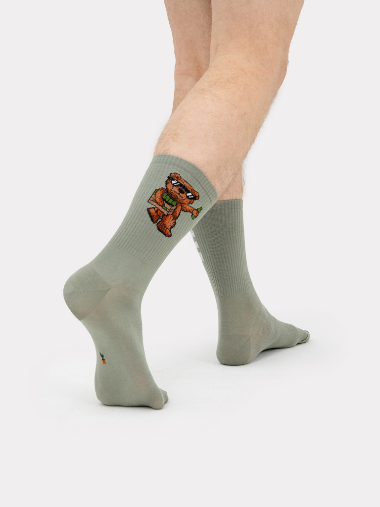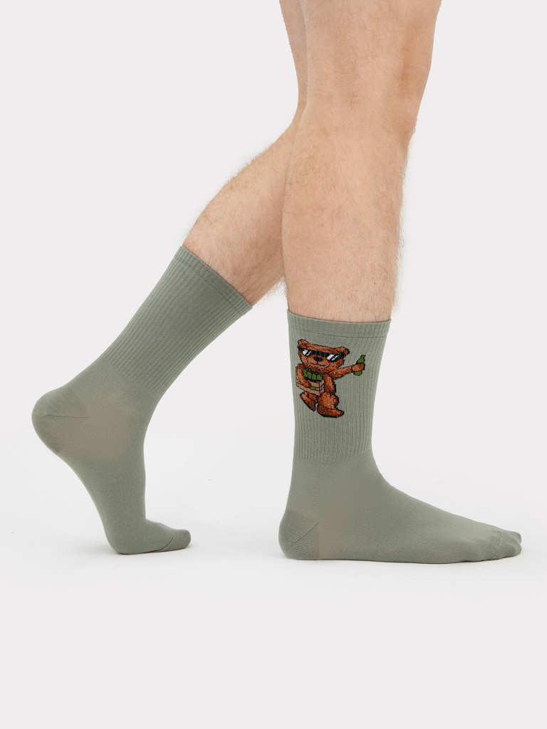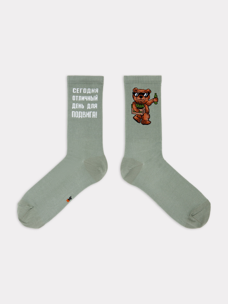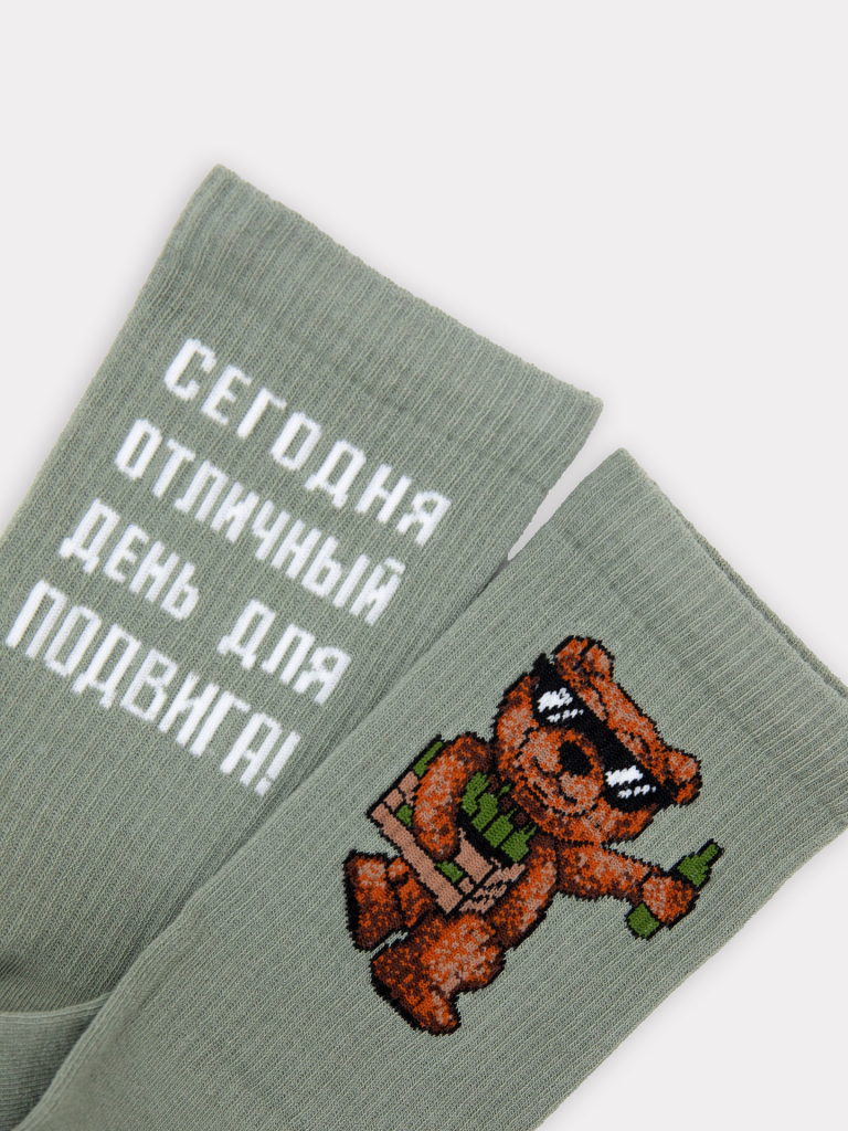 Носки мужские классические высокие с высоким плотным бортом и рисунком в виде медведя и надписи "Сегодня лучший день для подвига!" — нескучный вариант для ежедневной носки. Длинные носки мужские однотонные изготовлены из гребенного хлопка - пряжи высочайшего качества, мягкой, тонкой, но прочной. Натуральные волокна отлично пропускают воздух, позволяя коже дышать, и впитывают влагу, дарят ощущение комфорта в течение всего дня. Благодаря небольшому количеству эластана в составе, длинные носки хорошо облегают стопу и сохраняют форму даже после множества стирок. Мягкая эластичная резинка надежно удерживает носки на ноге, но не давит. Пятка и мысок дополнительно усилены, что гарантирует защиту от протирания и повышенную износостойкость — мужские носки с принтом прослужат долго. Отличный выбор на каждый день. Рекомендуем!