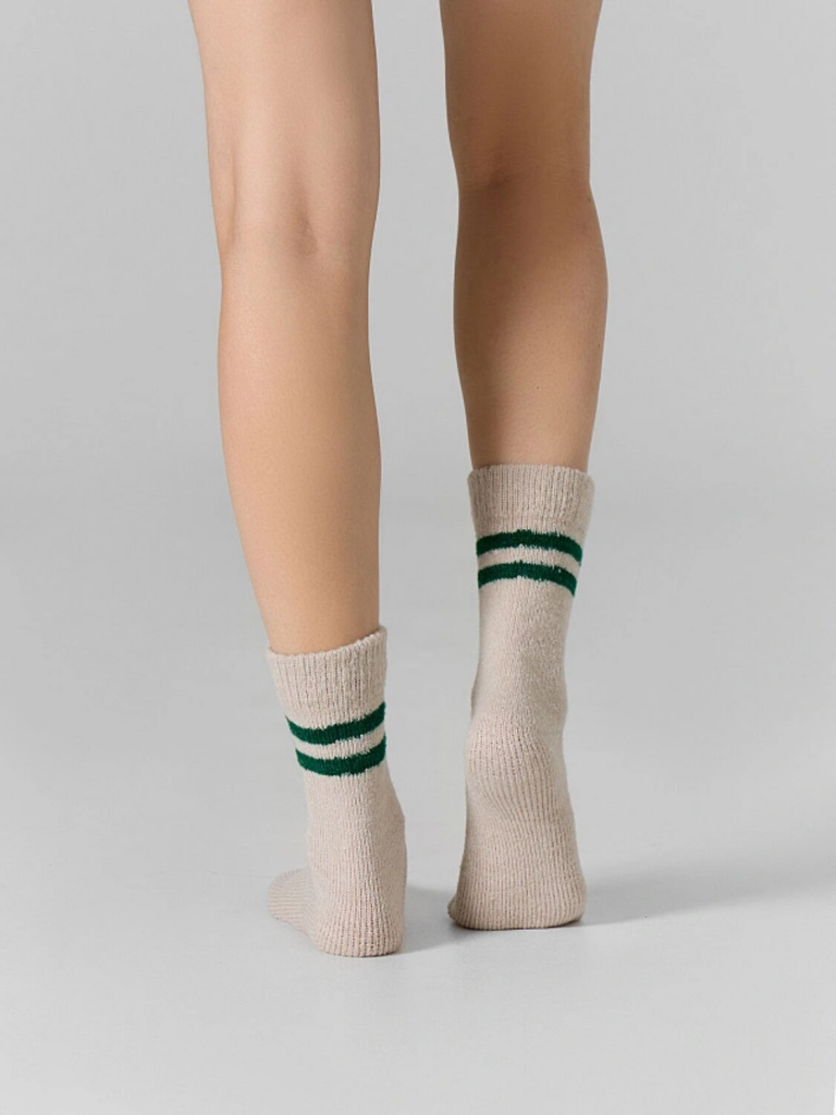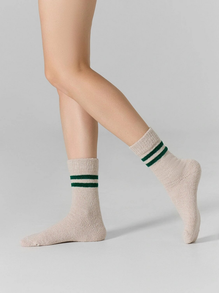 Носки женские бежевые с полосками — элегантный аксессуар для повседневного гардероба. Модель с высоким голенищем украшена классическим рисунком в виде полосок. Носки выполнены из комбинированных материалов, что обеспечивает идеальный баланс комфорта и функциональности.