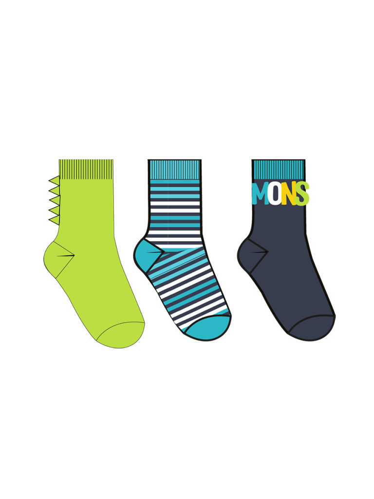 Набор детских носков для мальчика. Носки из высококачественного хлопка с добавлением нейлона и эластана. Комфортная модель с усиленным мыском и пяткой. Мягкая широкая резинка хорошо фиксируется по ноге ребенка. 3 пары в сете. Декоративный элемент, эмитирующий спинку динозаврика.