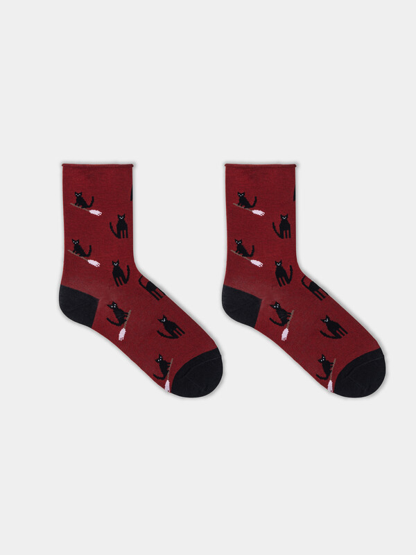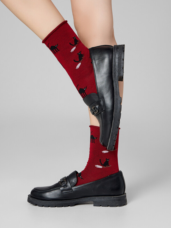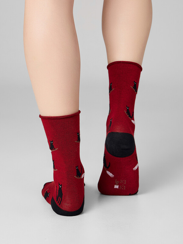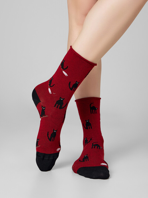 Забавный принт с черными котиками, летающими на метле, создает настроение легкости и магии. Усиленные пятка и мысок предотвращают быстрое истирание, а эластичная резинка мягко фиксирует носки, не сползая и не оставляя следов. Плоские швы исключают натирание, обеспечивая комфорт в течение всего дня.