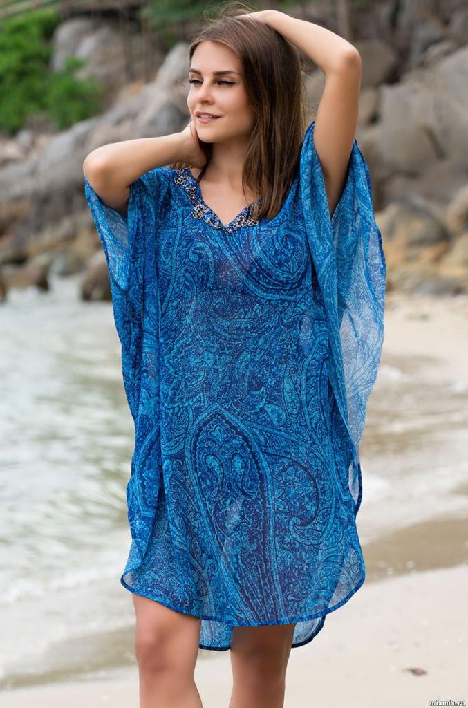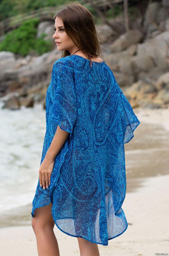 Короткая туника Mia-Amore с рукавом летучая мышь выполнена из принтованного шифона в морской синей гамме, низ туники имеет овальную форму, горловина оформлена бисером и паетками.