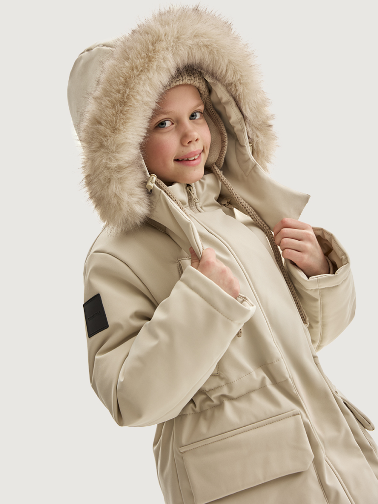 Парка из мембранной ткани 3000/3000. Мембранная ткань это непродуваемый и водонепроницаемый материал, который надежно защищает от ветра и влаги. Благодаря дышащим свойствам мембраны ребенку будет комфортно в любую погоду и он не вспотеет.