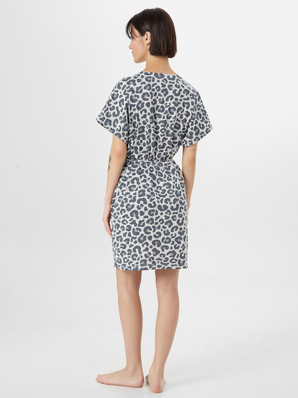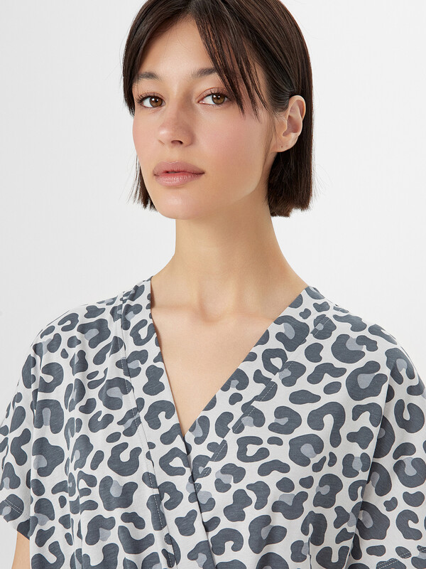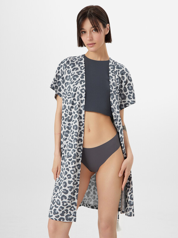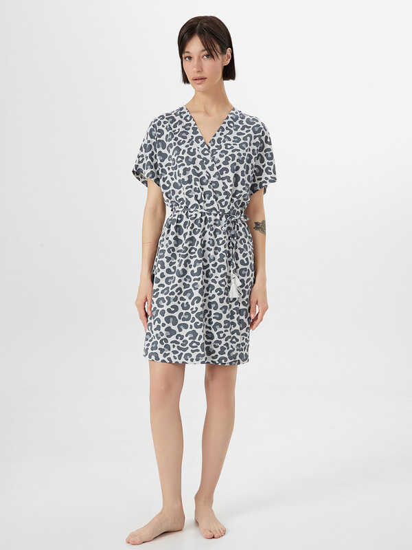 Хлопковый женский халат с короткими рукавами. Модель запахивается и дополнительно фиксируется с помощью тонкого пояса с декоративными кисточками. Длина халата чуть выше колена. Уютно и стильно!
