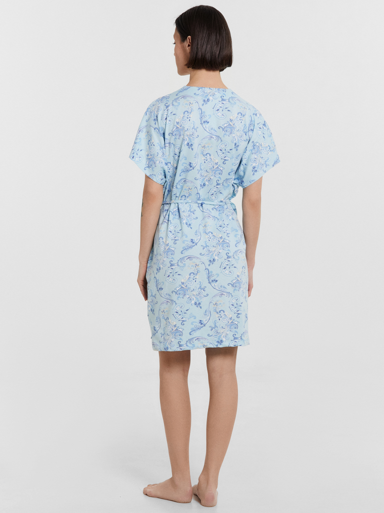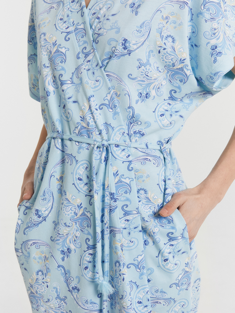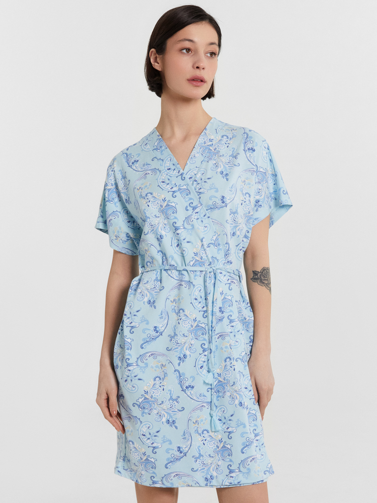 Хлопковый женский халат с короткими рукавами. Модель запахивается и дополнительно фиксируется с помощью тонкого пояса с декоративными кисточками. Длина халата чуть выше колена. Уютно и стильно!