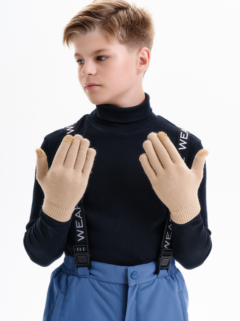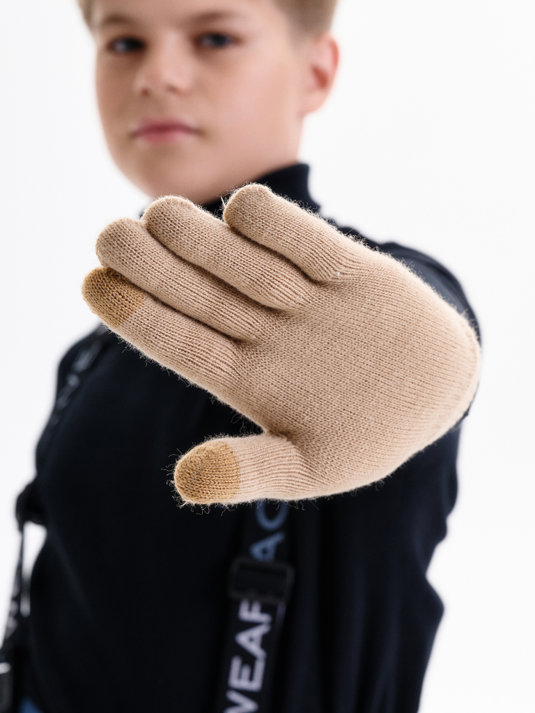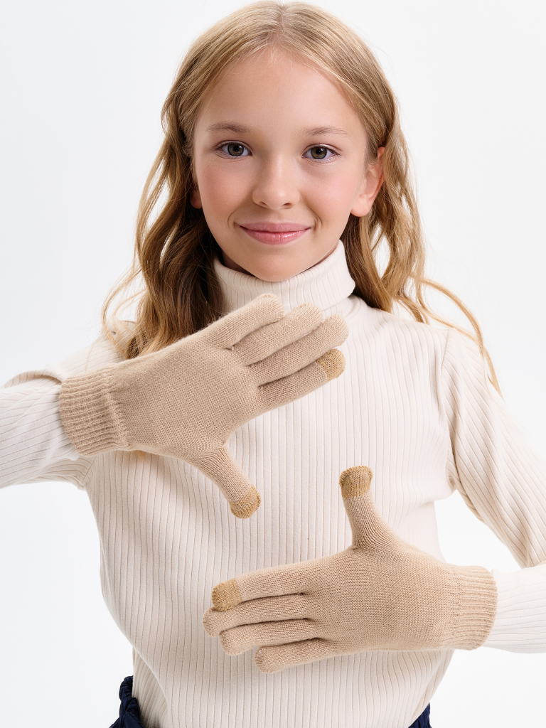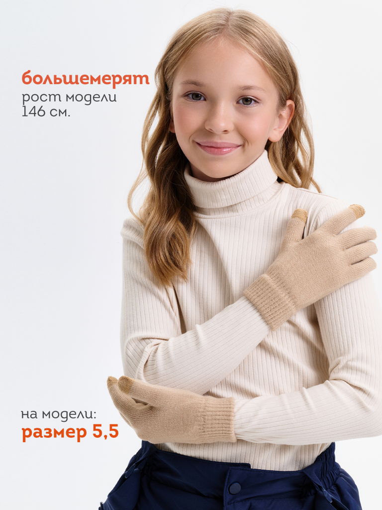 Вязаные перчатки с сенсорными пальцами — удобство и тепло для детей Эти демисезонные вязаные перчатки для мальчиков и девочек выполнены гладью — ровные и эластичные, отлично садятся по руке и сохраняют форму. На указательном и большом пальцах есть вставки с тач-эффектом, которые позволяют пользоваться сенсорными экранами без снятия перчаток. Перчатки хорошо тянутся и обеспечивают комфортную посадку, защищая руки от холода в прохладную погоду. Идеальный выбор среди демисезонных перчаток для детей, сочетающий практичность и стиль.