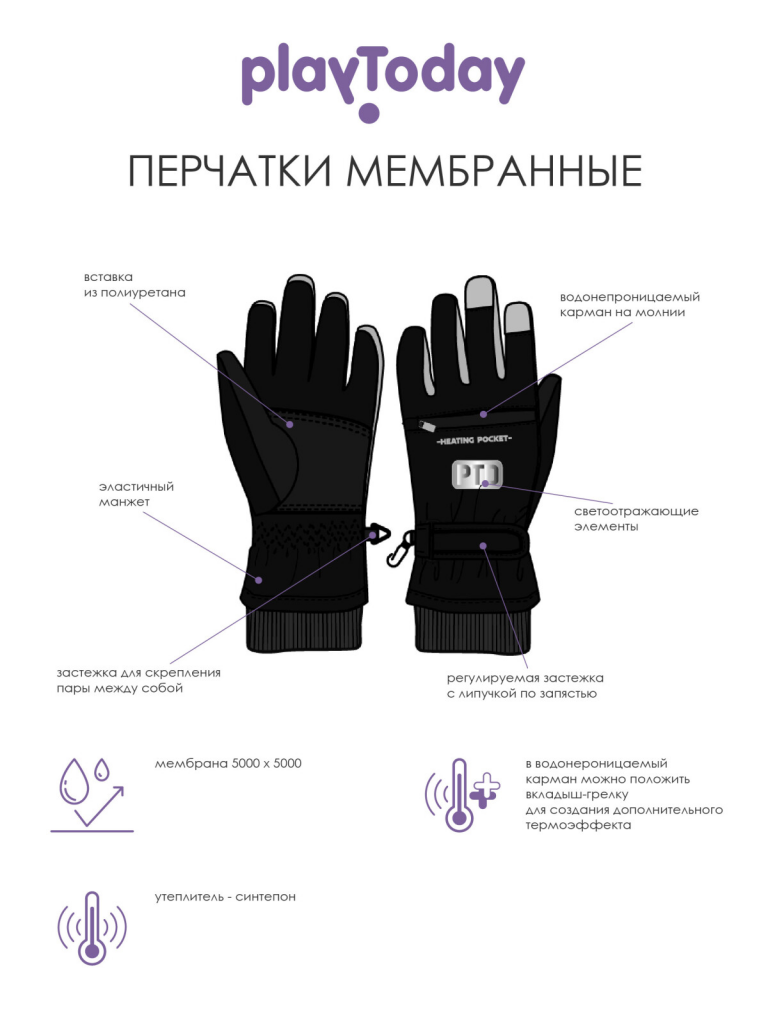 Зимние перчатки с мембраной. Утеплитель - синтепон. Мягкая ладошка из влагостойкого полиуретана. Регулируемая застёжка с липучкой по запястью. Застежка для скрепления пары между собой. Эластичный манжет. Светоотражающие элементы. Водонепроницаемый карман на молнии.