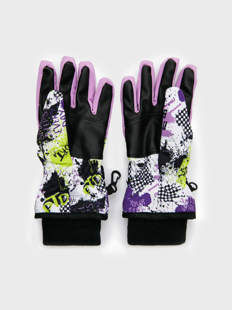Перчатки для девочки подростка. Утепленные перчатки из мембранной ткани 5000*5000 - необходимый аксессуар для холодного времени года (осень, зима). Перчатки имеют флисовую подкладку и тесьму с карабинами, благодаря которой можно крепить перчатки друг к другу. Трикотажный манжет с защитой от снега. Специальный протектор на ладонной части усиливает износостойкость изделия и возможность регулировки ширины запястья.