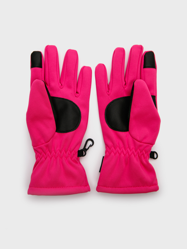 Перчатки для девочки подростка. Утепленные softshell (обеспечивает отличную вентиляцию, защиту от легких осадков и сильного ветра) перчатки с мембранной тканью 5000*5000 - необходимый аксессуар для холодного времени года (осень, зима). Светоотражающие элементы. Специальный протектор на ладонной части усиливает износостойкость изделия. Перчатки имеют эластичную тесьму с карабинами, благодаря которой можно прикрепить перчатки друг к другу.