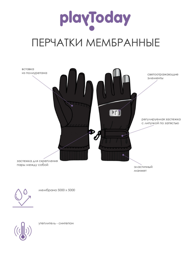 Зимние перчатки с мембраной. Утеплитель - синтепон. Мягкая ладошка из влагостойкого полиуретана. Регулируемая застёжка с липучкой по запястью. Застежка для скрепления пары между собой. Эластичный манжет. Светоотражающие элементы.