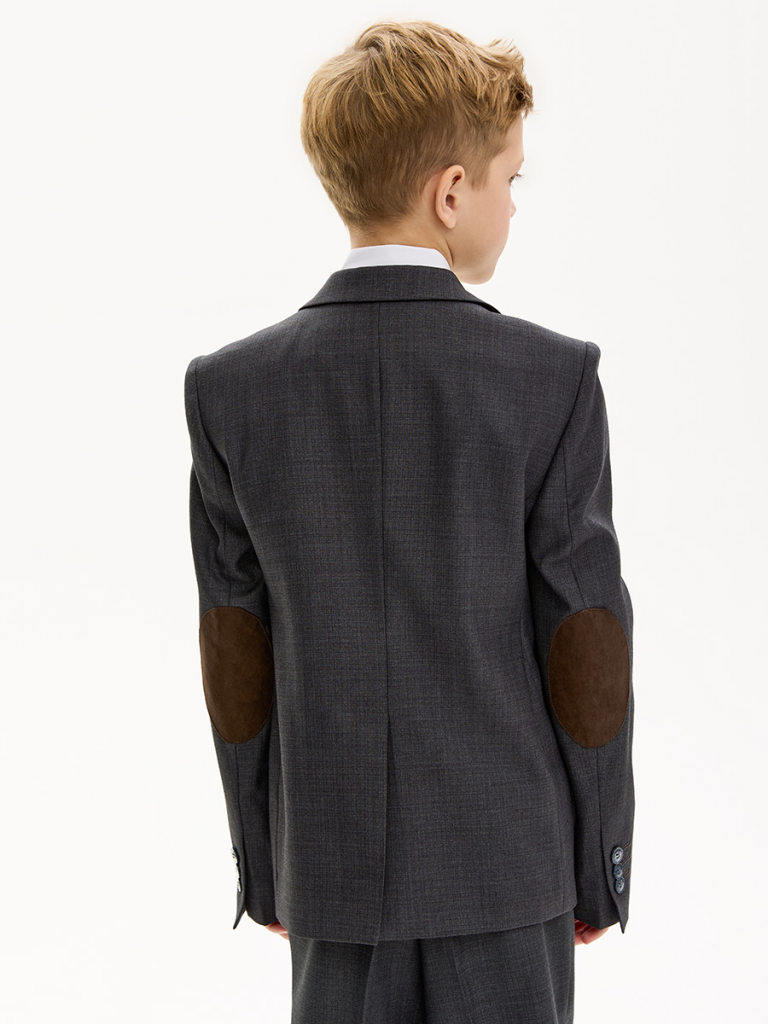 Пиджак с налокотниками и деталями из отделочной ткани – идеальное решение для мальчика, который ценит комфорт и стиль. Прочная, качественная костюмная ткань с содержанием вискозы не мнется и обеспечивает удобство при носке. Пиджак имеет треугольный вырез и отложной воротник с лацканами, которые придают ему строгий и элегантный вид. Полуприлегающий силуэт с вытачками обеспечивает идеальную посадку по фигуре ребенка.