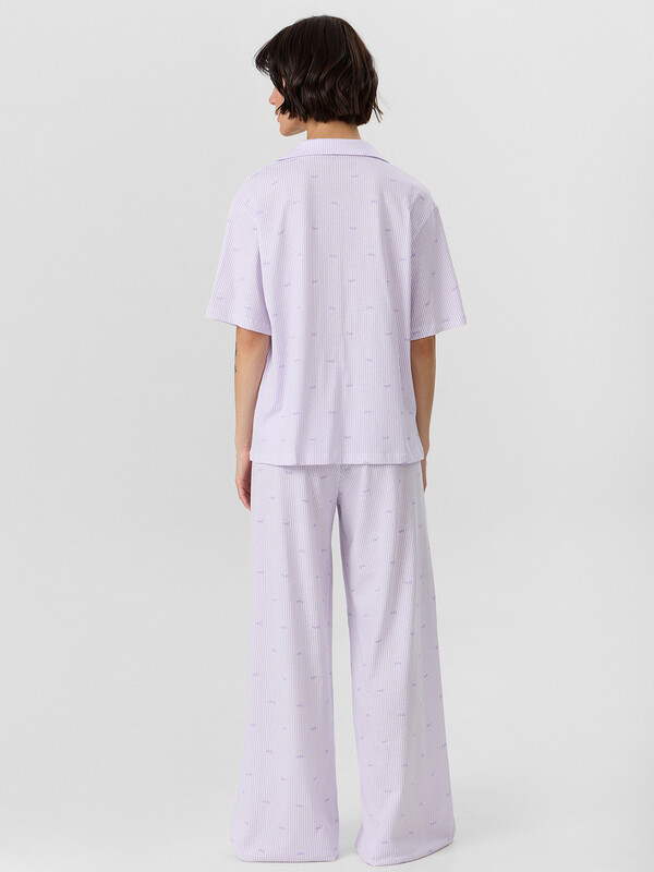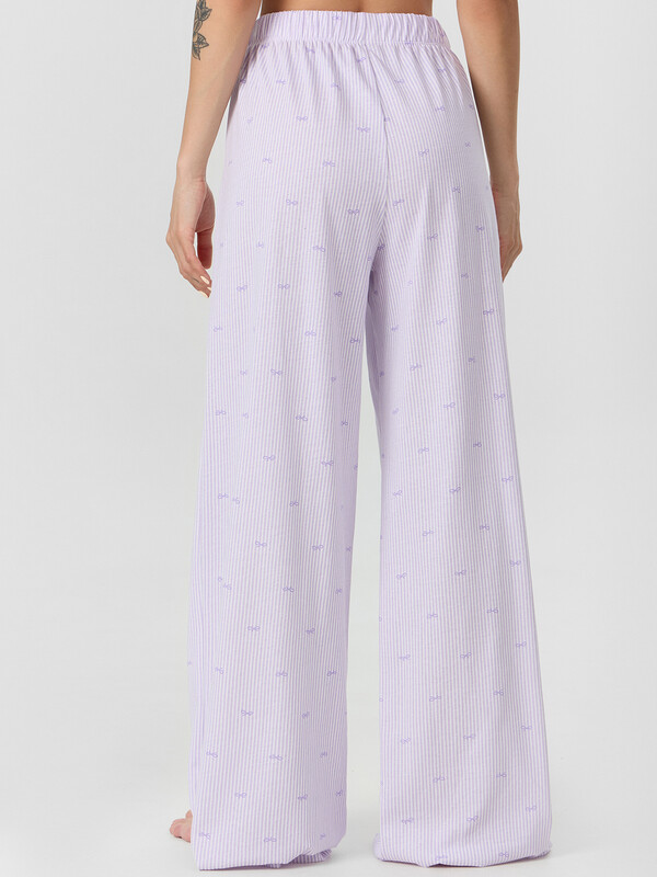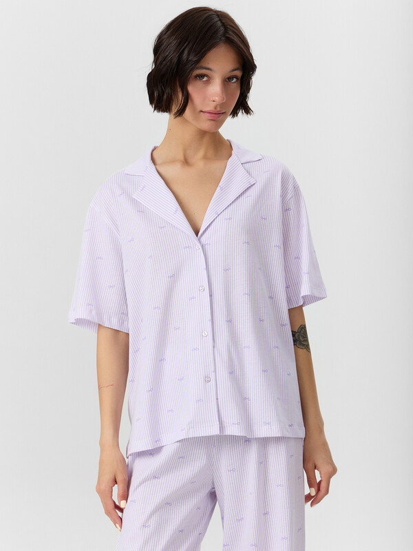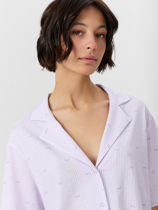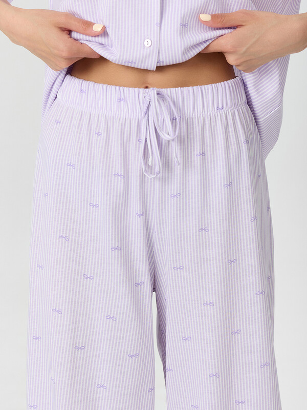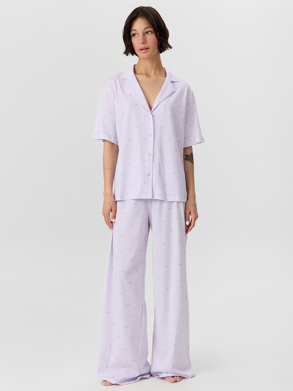 Женский домашний комплект, состоящий из рубашки и брюк, — это идеальное решение для комфортного отдыха и уютных домашних вечеров. Модель выполнена из натурального хлопка, который отличается мягкостью, воздухопроницаемостью и гипоаллергенными свойствами, обеспечивая приятные ощущения на коже и свободу движений. Рубашка свободного силуэта с отложным воротником выглядит аккуратно и стильно, а короткий рукав с немного спущенной линией плеча подчеркивает расслабленный характер изделия. Обработка рукава и низа швом в подгибку делает модель аккуратной и долговечной. Центральная застёжка на пуговицы с петлями добавляет удобства и классического акцента. Брюки свободного силуэта с посадкой на талии обеспечивают комфорт и не стесняют движений. Эластичный пояс мягко фиксируется, а декоративная бейка из основного полотна, протянутая через пробитые петли, добавляет стильный элемент. Низ брюк также обработан швом в подгибку, что сохраняет форму и аккуратность. Комплект идеально подходит для сна, отдыха или домашних дел, сочетая в себе практичность, уют и эстетичный внешний вид.