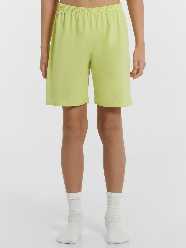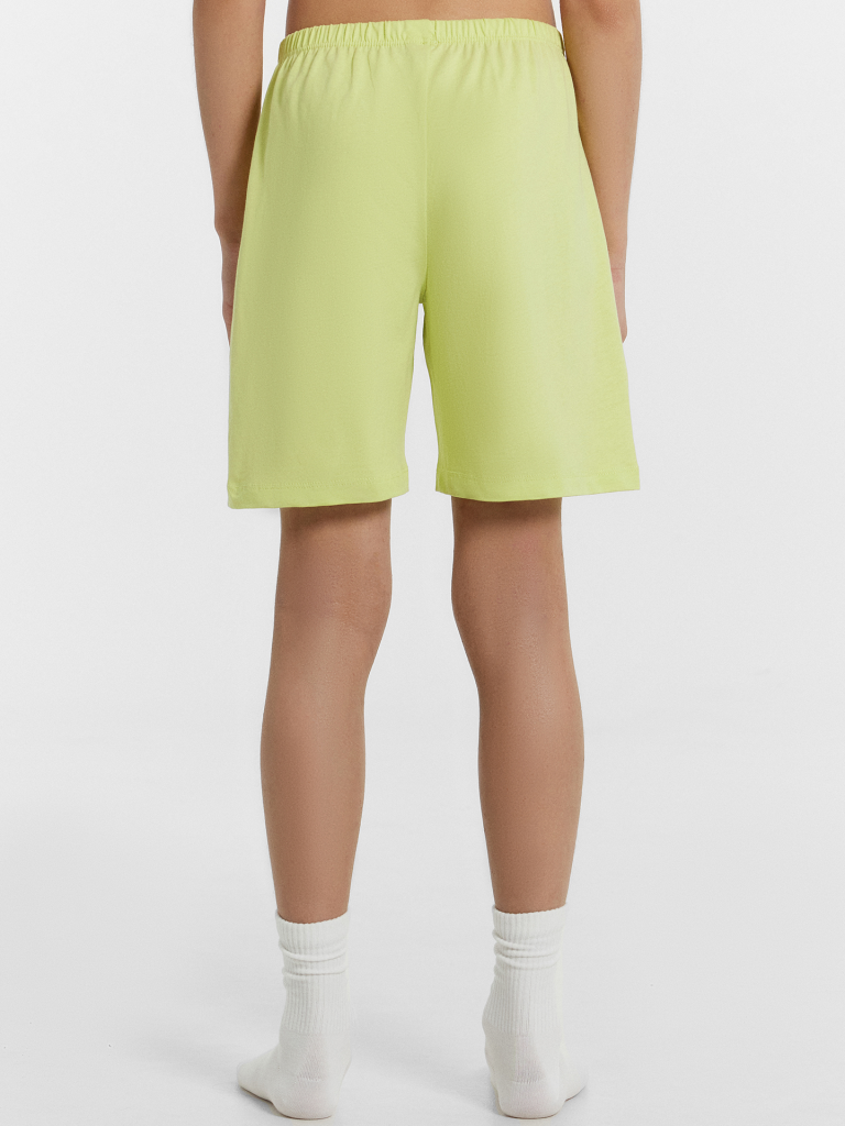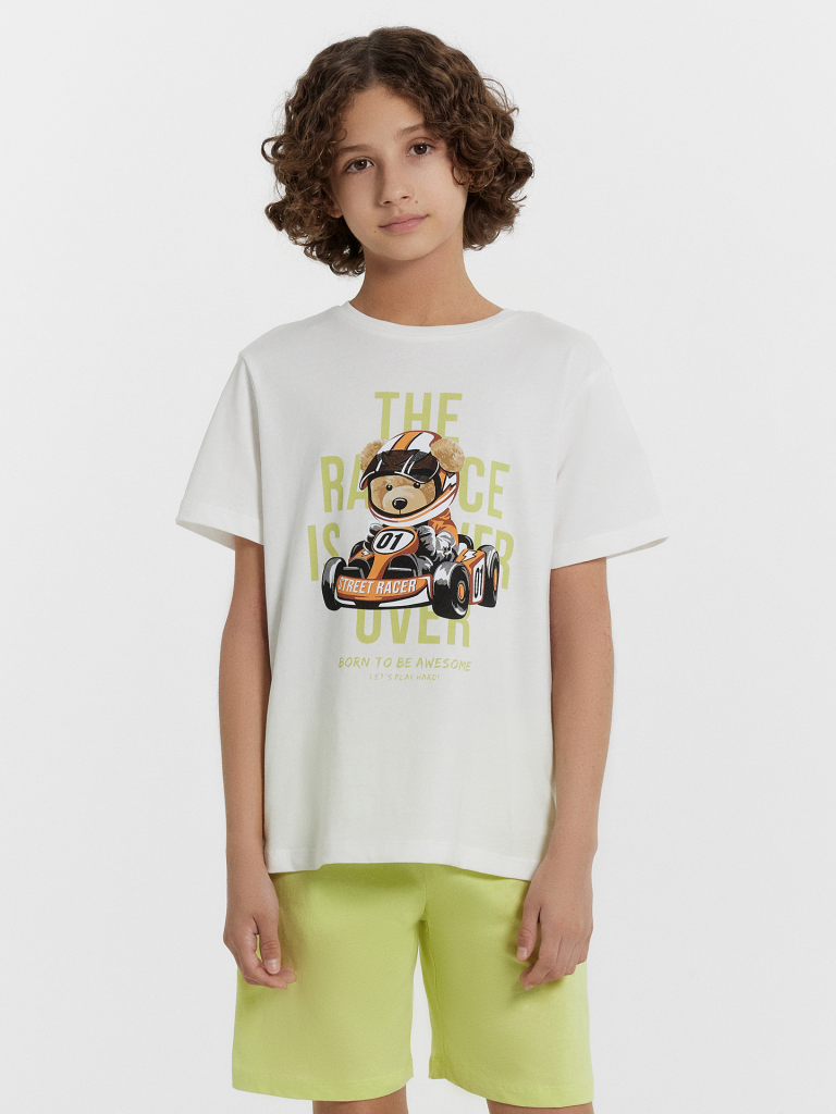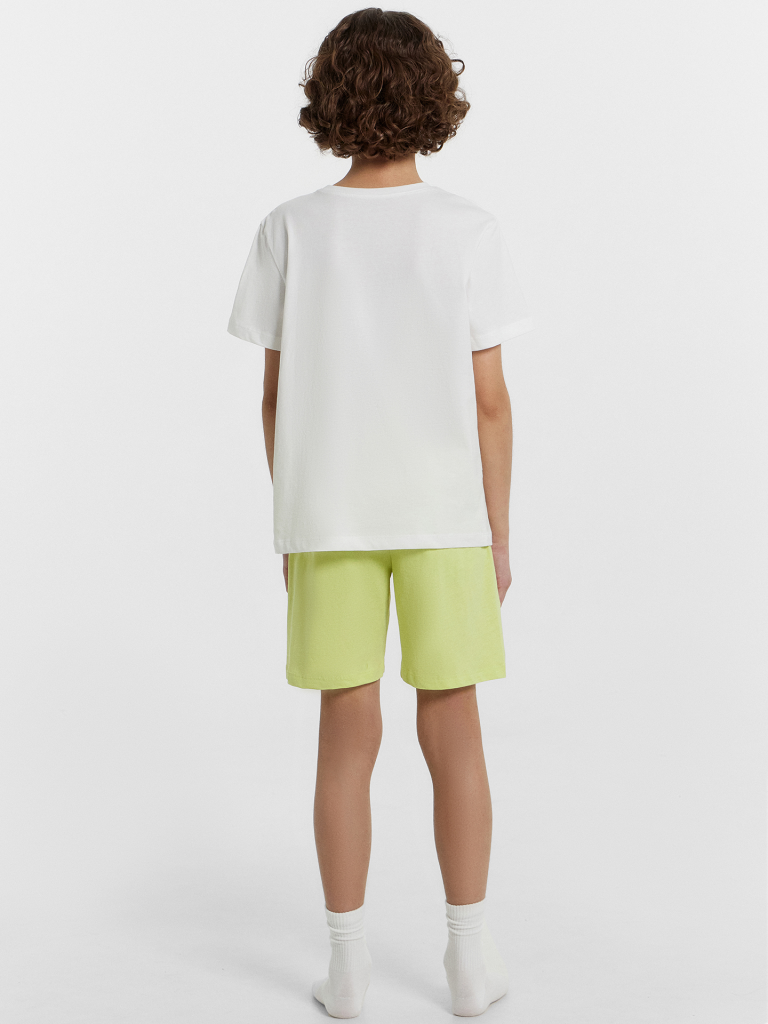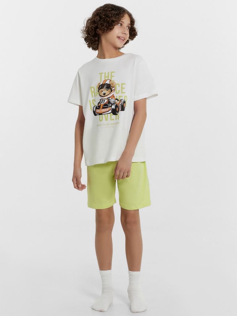 Пижама для мальчиков из хлопкового полотна кулирного переплетения. Футболка классическая, с круглой горловиной и короткими рукавами. Шорты длиной до колен или чуть выше. В поясе – эластичная тесьма. Комфортно!