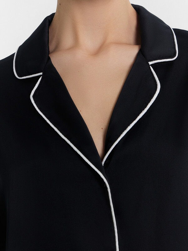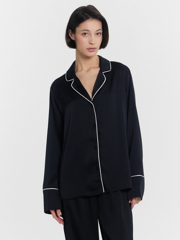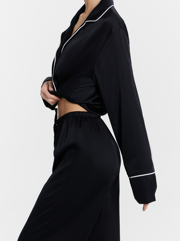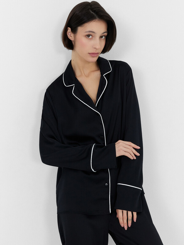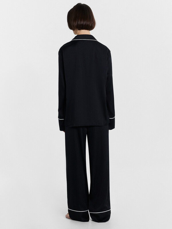 Эта женская пижама идеально подходит для создания элегантных домашних образов. Жакет прямого силуэта с отложным воротником и лацканами, украшенными кантом, придает изделию изысканный вид. Длинные рукава с манжетами, также декорированными кантом, добавляют элегантности и удобства. Жакет застегивается на пуговицы, а на передней части расположен карман. Брюки свободного силуэта с манжетами, украшенными кантом, обеспечивают комфорт и стиль. Изделие выполнено из спандекса, обладающего высокой степенью растяжимости, что делает одежду комфортной и позволяет ей сохранять форму даже после многочисленных стирок. Этот материал мягкий и приятный на ощупь, что делает его идеальным для одежды, предназначенной для длительного ношения. Пижама Mark Formelle станет отличным выбором для тех, кто ценит как комфорт, так и элегантность в домашней одежде.