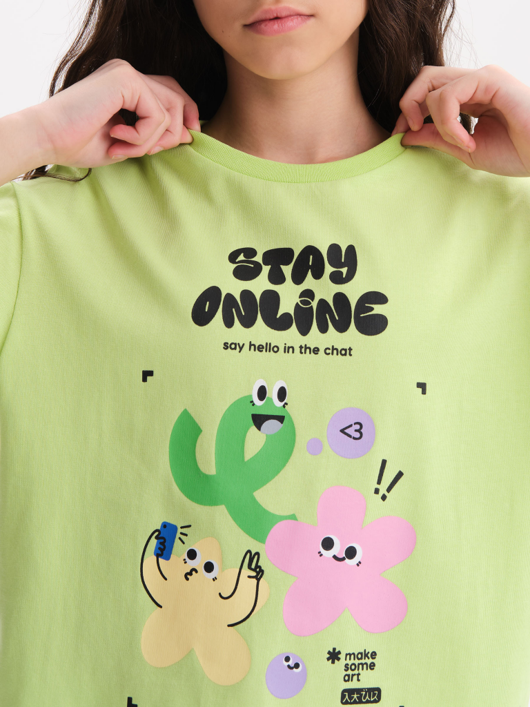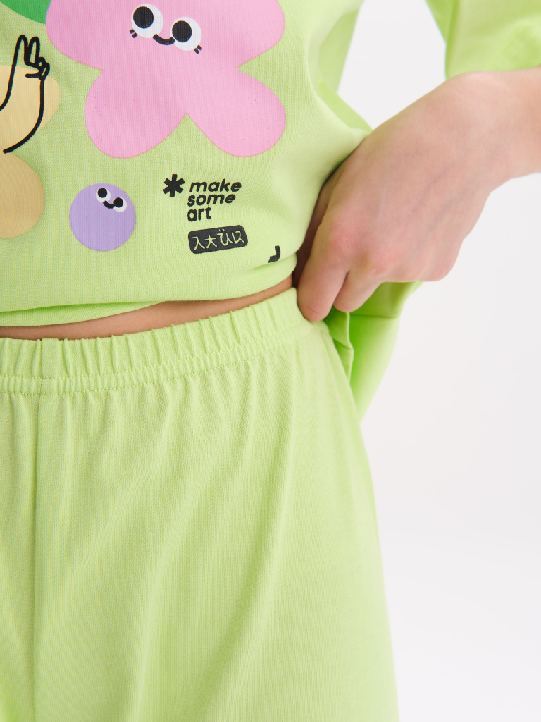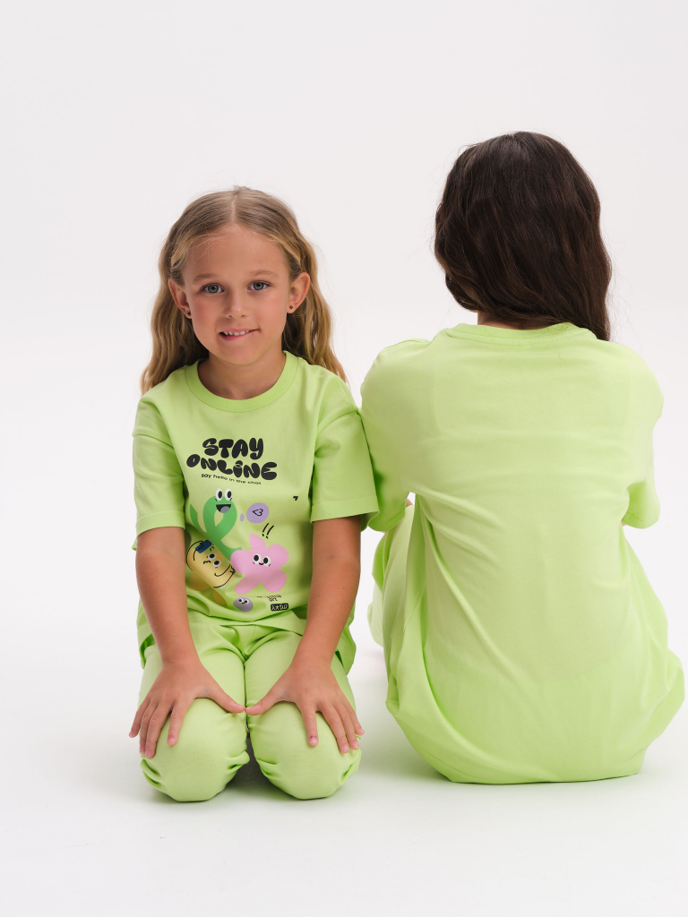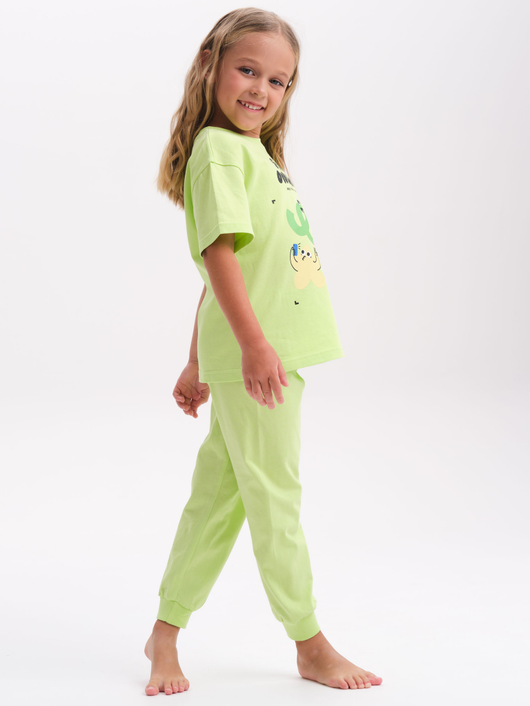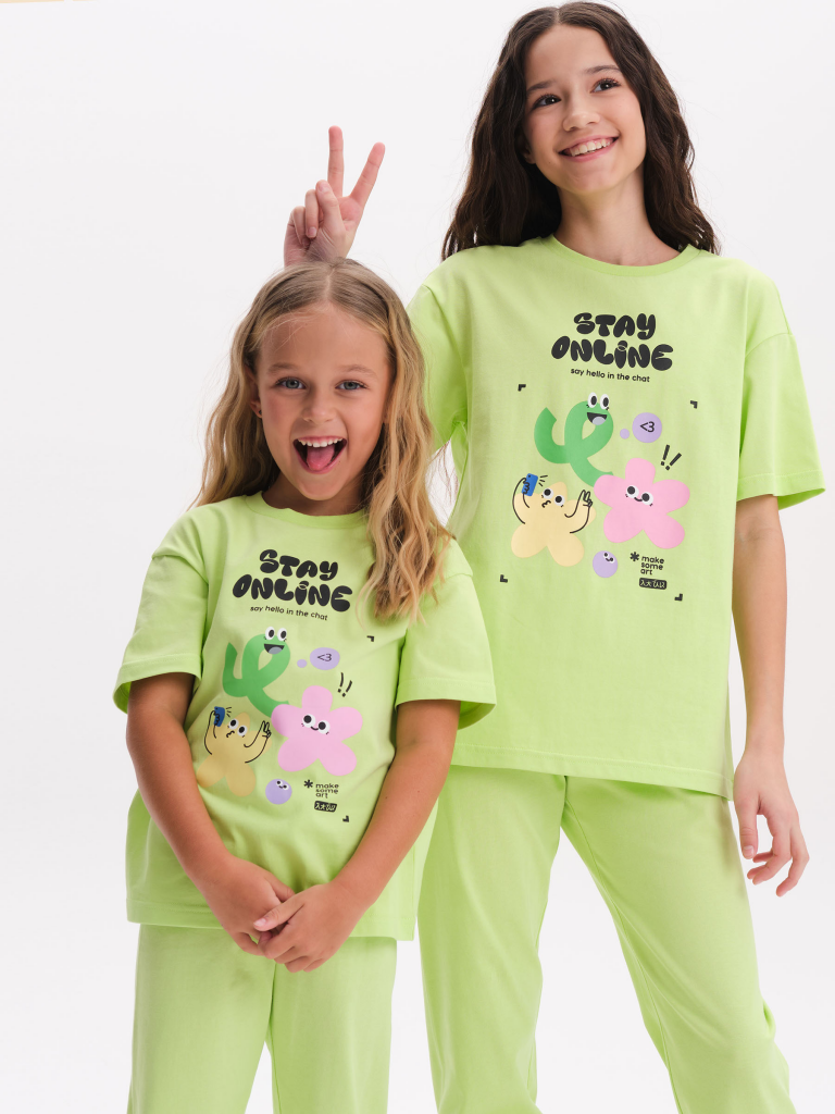 Стильная и уютная пижама актуального цвета для девочки. В составе ткани 100% хлопка — идеально для детской одежды! Модель приятна на ощупь, прекрасно пропускает воздух, позволяя коже ребёнка дышать. При этом в пижаме из хлопка ребёнку будет тепло, даже если он сбросит одеяло. Всё это обеспечивает комфортный и качественный сон. Футболка и брюки среднего объёма, плечо немного спущено, рукава широкие и свободные — в пижаме очень удобно спать. Широкая и мягкая резинка в поясе не перекручивается и не давит. Манжеты брюк и отделка горловины из эластичной рибаны — она не растягивается, ребёнку удобно надевать и снимать пижаму. Футболку украшает позитивный принт. Надписи переводятся: "исследуй новые идеи", "создай немного искусства". Хлопковый комплект идеален для сна как дома, так и в детском саду — прекрасный выбор для вашего ребёнка! Пижама с брюками подходит для круглогодичного использования. Домашний комплект — замечательный подарок дочке, внучке, сестре на любой праздник. Выбирайте нужный размер по таблице размеров на фото. Цвет товара на экране вашего устройства может отличаться от цвета изделия вживую.