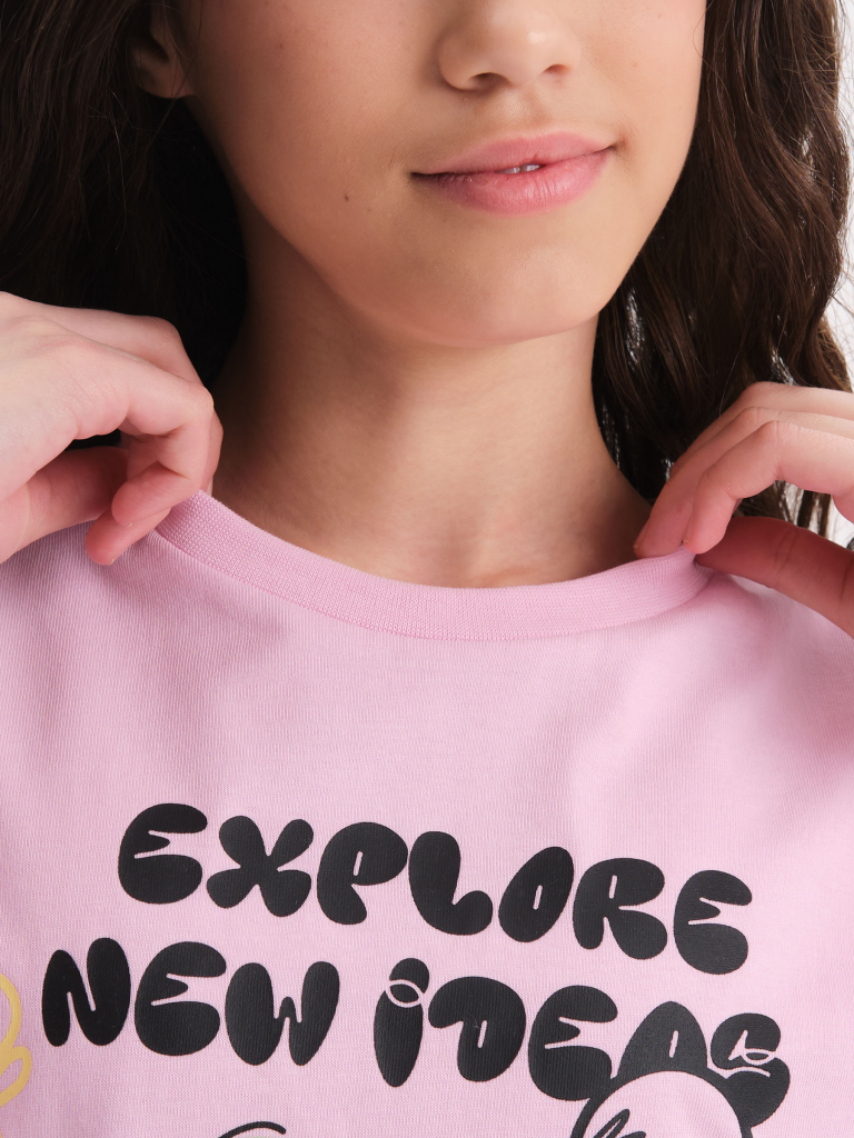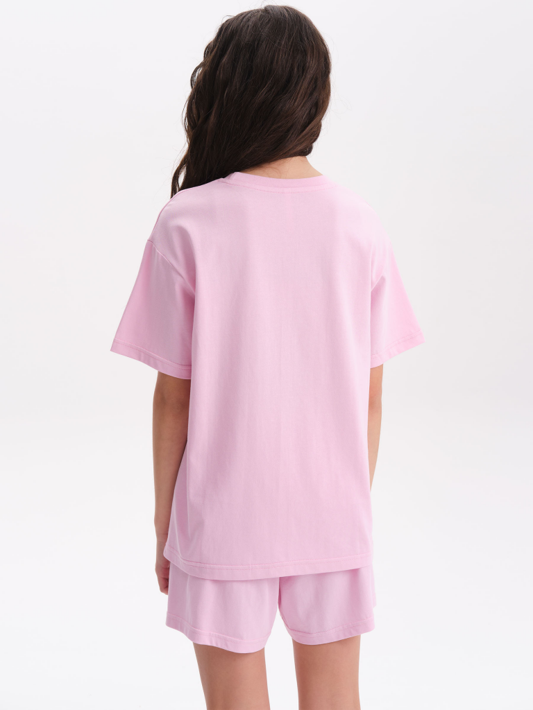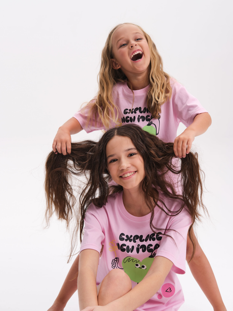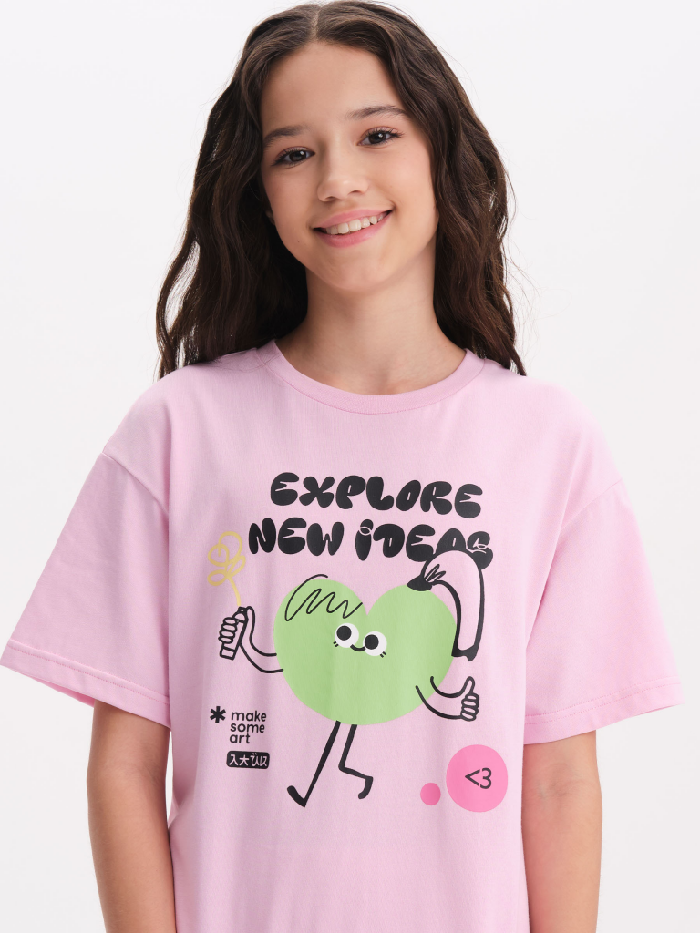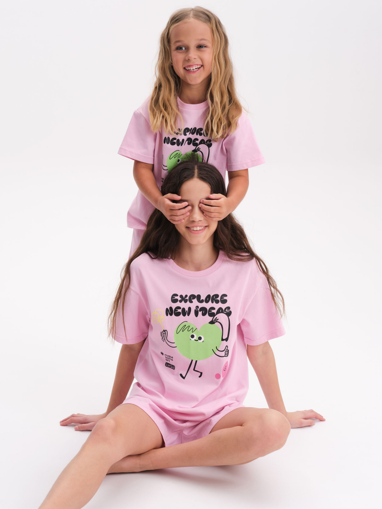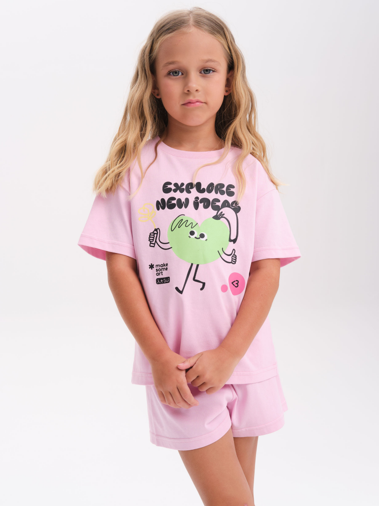 Стильная и уютная пижама актуального цвета для девочки. В составе ткани 100% хлопка — идеально для детской одежды! Модель приятна на ощупь, прекрасно пропускает воздух, позволяя коже ребёнка дышать. При этом в пижаме из хлопка ребёнку будет уютно, даже если он сбросит одеяло. Всё это обеспечивает комфортный и качественный сон. Свободная футболка и комфортные шорты, плечо немного спущено, рукава широкие — в пижаме очень удобно спать. Широкая и мягкая резинка в поясе не перекручивается и не давит. Отделка горловины из эластичной рибаны — она не растягивается, ребёнку удобно надевать и снимать пижаму. Футболку украшает позитивный принт. Надписи переводятся: "исследуй новые идеи", "создай немного искусства". Домашний комплект — замечательный подарок дочке, внучке, сестре на любой праздник. Выбирайте нужный размер по таблице размеров на фото. Цвет товара на экране вашего устройства может отличаться от цвета изделия вживую.