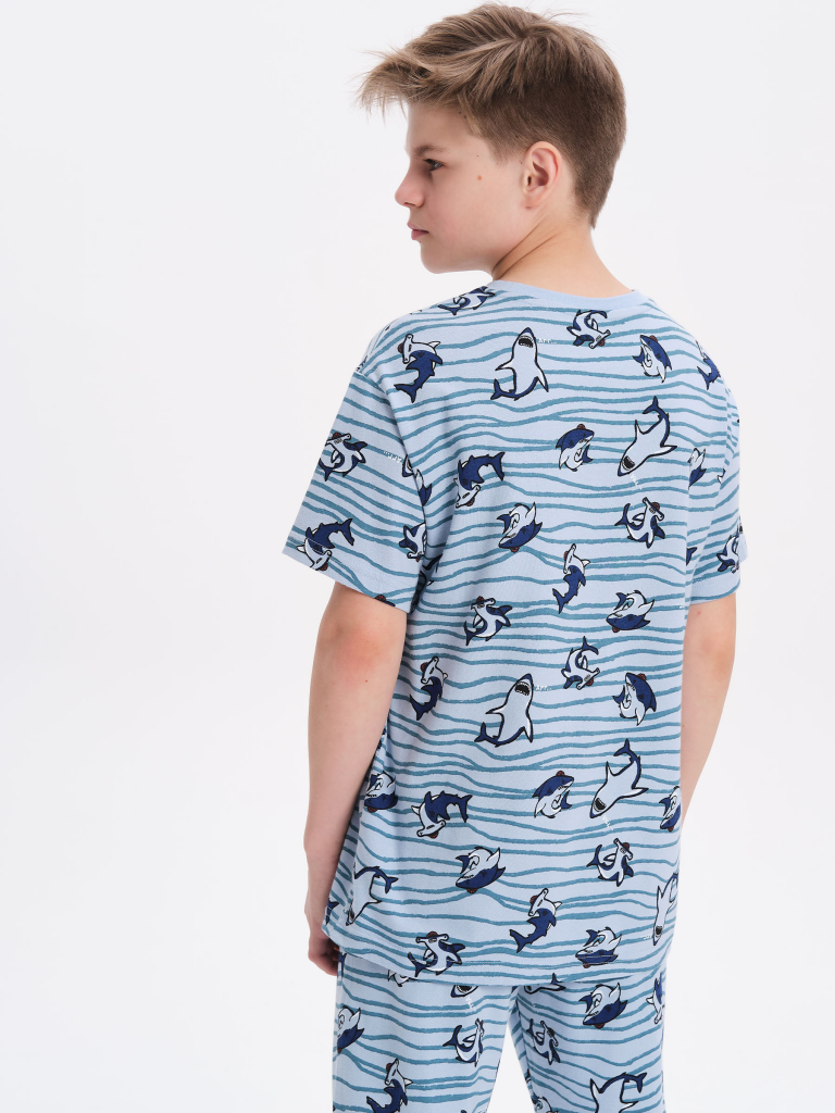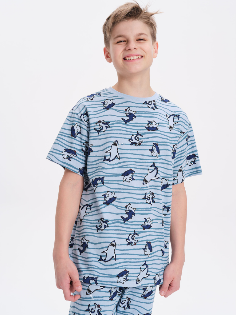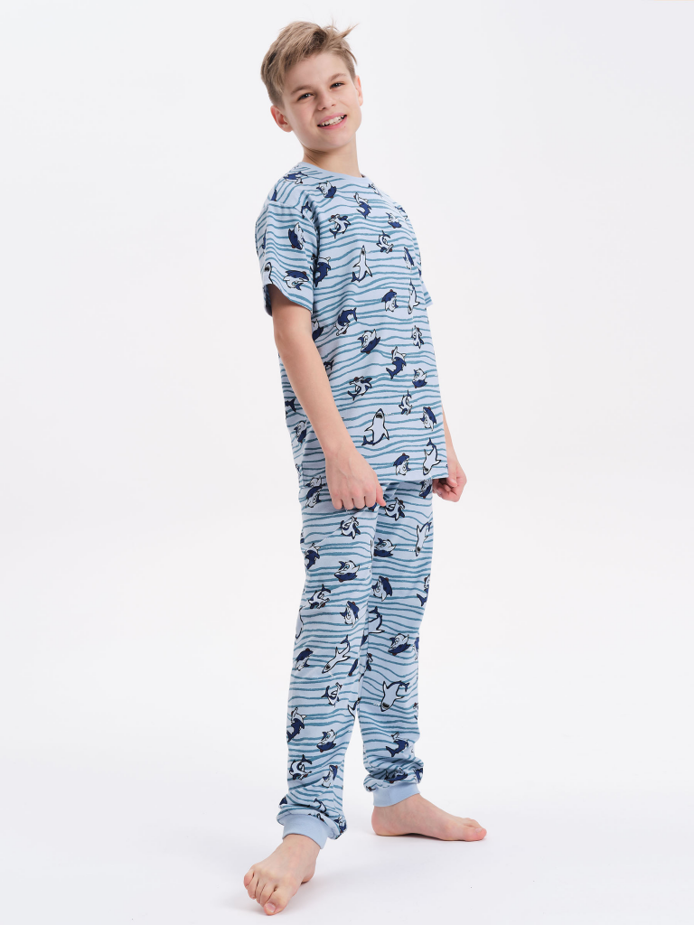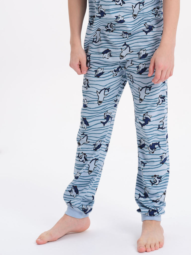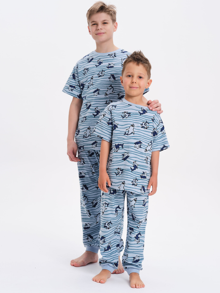 Уютная пижама для мальчика. Изделие выполнено из 100% хлопка — идеальный вариант для детской пижамы. Ткань из хлопка приятна на ощупь и превосходно пропускает воздух, позволяя коже ребёнка дышать. В пижаме из хлопка ребёнку будет комфортно, даже если он сбросит одеяло. Футболка и брюки умеренного объёма, рукава свободные — пижама очень удобна для сна. В поясе брюк мягкая и широкая резинка — не перекручивается и не давит. Манжеты брюк и отделка горловины джемпера из эластичной рибаны — комплект удобно надевать и снимать. А также резинка отлично сохраняет форму в течение долгого времени. Пижама выполнена в all-over принт в морской тематике. Принт мягкий и эластичный, отлично переносит многочисленные стирки. Комплект подходит для сна как дома, так и в детском саду — прекрасный выбор для вашего ребёнка!