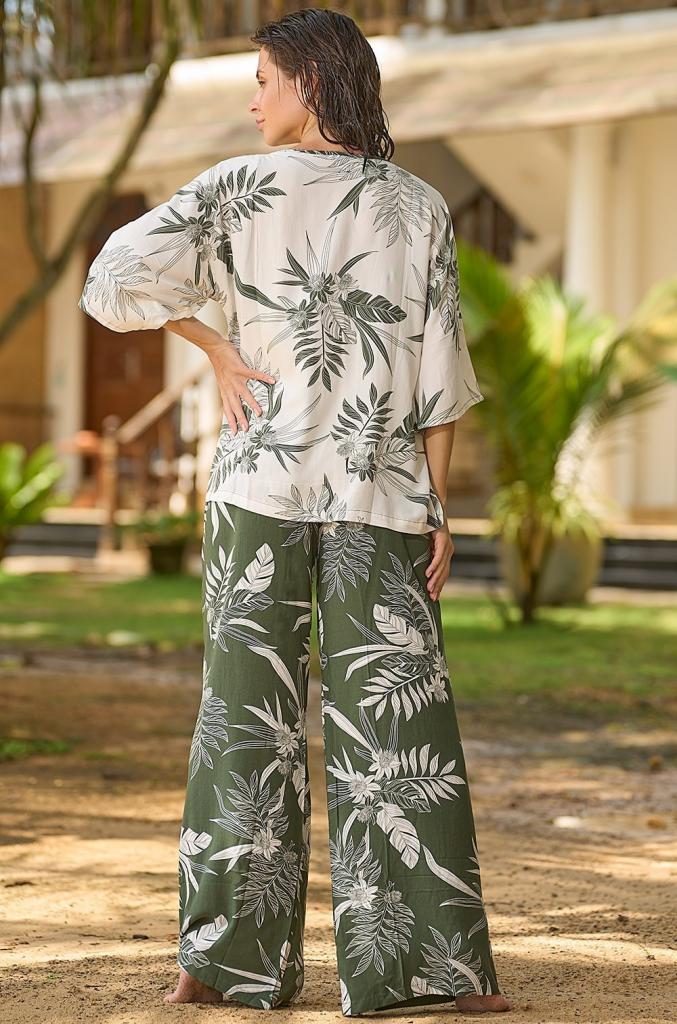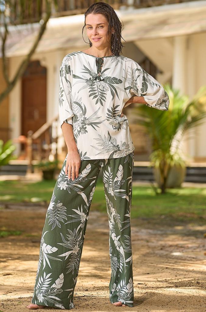 Комплект Mia-Amore состоит из блузы свободного силуэта с рукавом длиной до линии локтя и широких брюк. Комплект выполнен из комбинации двух цветовых сочетаний тканой вискозы. По бокам брюк расположены карманы.