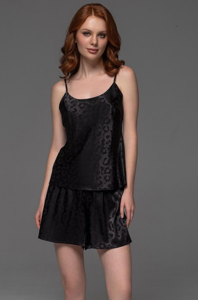 Комплект Mia-Amore состоит из топа на тонких бретелях и шорт. Изделия комплекта выполнены из искусственного шелка на жаккардовой основе.
