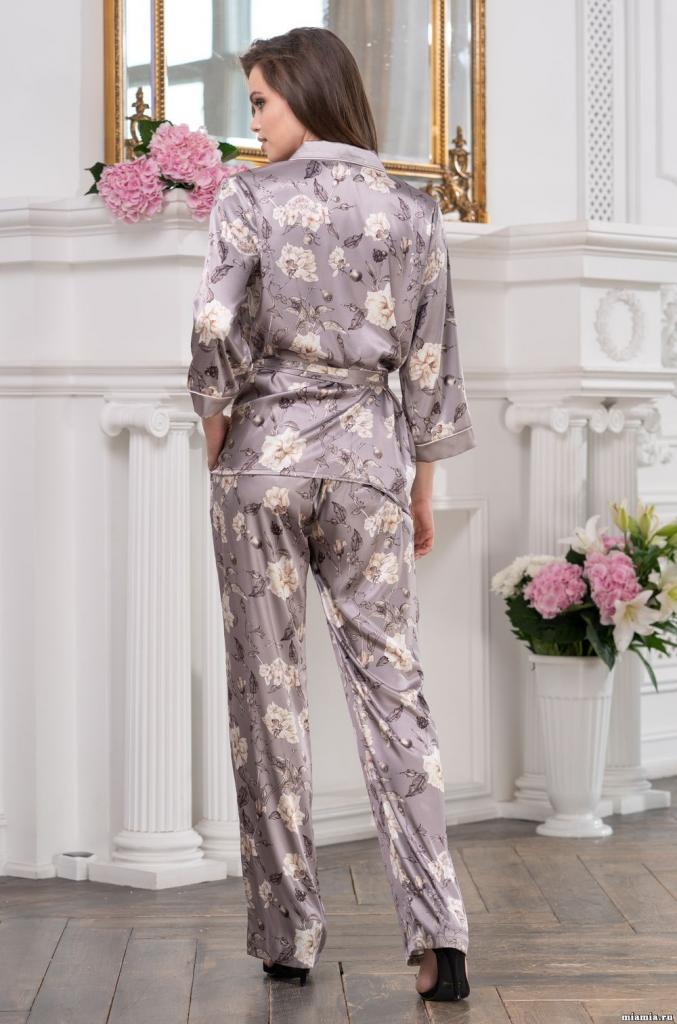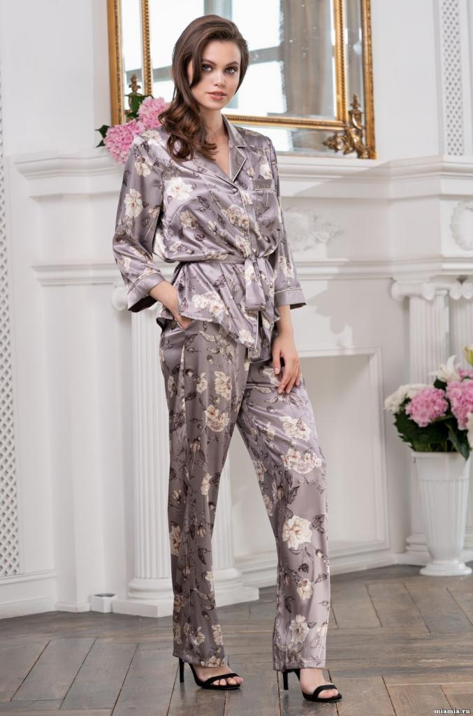 Элегантный комплект-двойка Mia-Amore из смесового шелкового полотна с изящным принтом, состоит из жакета на пуговицах и брюк, по краю борта и рукавов жакета – контрастный атласный кант, на груди маленький декоративный кармашек.
