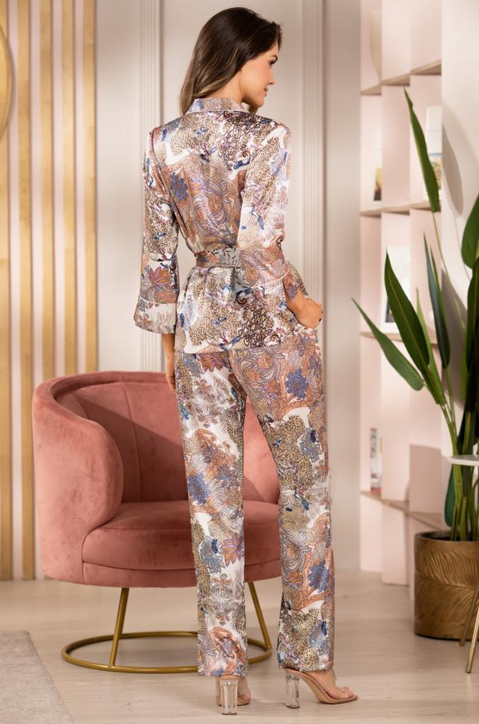 Комплект Mia-Amore состоит из жакета и брюк, выполнен из смесового шелка с отделкой в виде контрастного канта. В боковых швах брюк обработаны карманы. Линию талии можно подчеркнуть за счет пояса, который идет в комплекте.