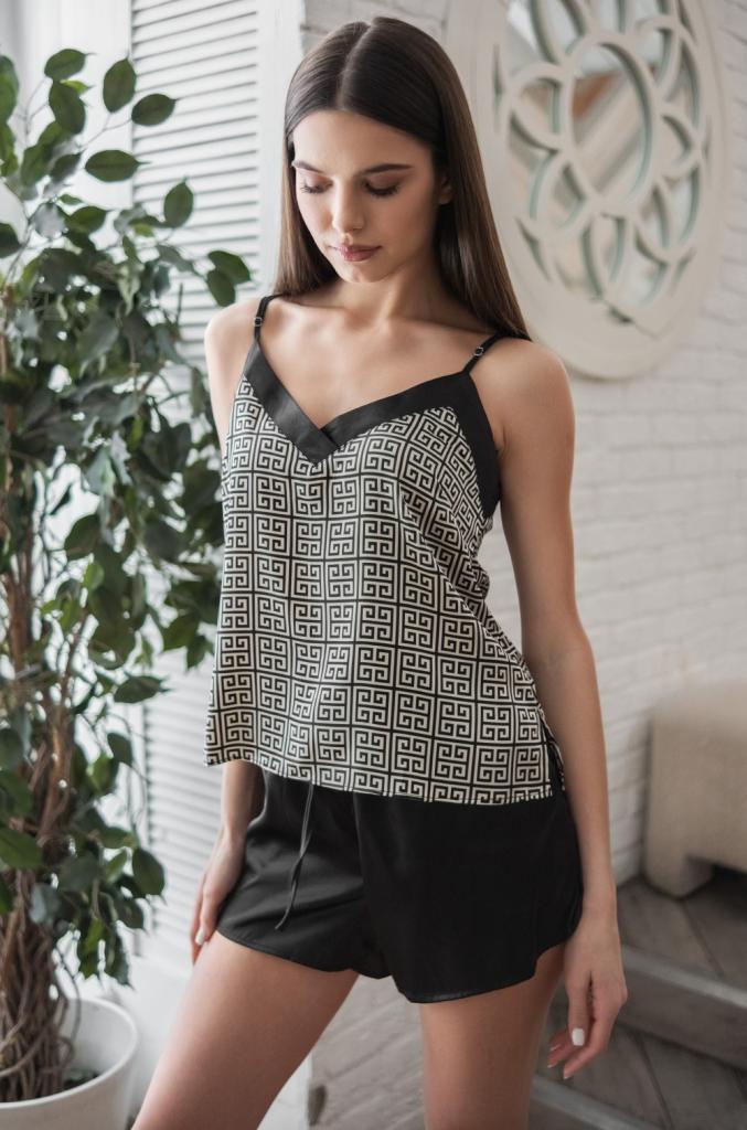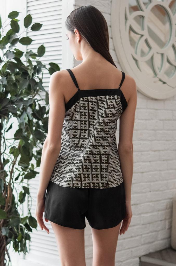 Комплект Mia-Amore состоит из топа на тонких бретелях и шорт. Топ выполнен из принтованного смесового шелка с однотонной отделкой, а шорты из однотонного. По бокам расположены карманы. По низу шорт обработаны разрезы.