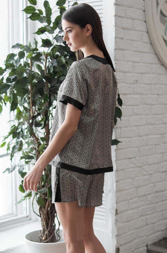 Комплект Mia-Amore состоит из жакета с коротким рукавом и шорт. Комплект выполнен из принтованного смесового шелка с однотонной отделкой. По бокам шорт расположены карманы.