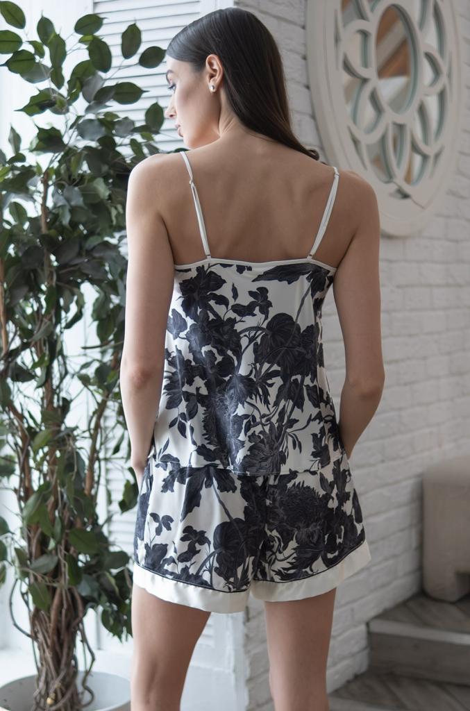 Комплект Mia-Amore состоит из топа на тонких бретелях и шорт. Комплект выполнен из принтованного смесового шелка с однотонной отделкой. По бокам шорт расположены карманы. По низу манжет обработаны разрезы.