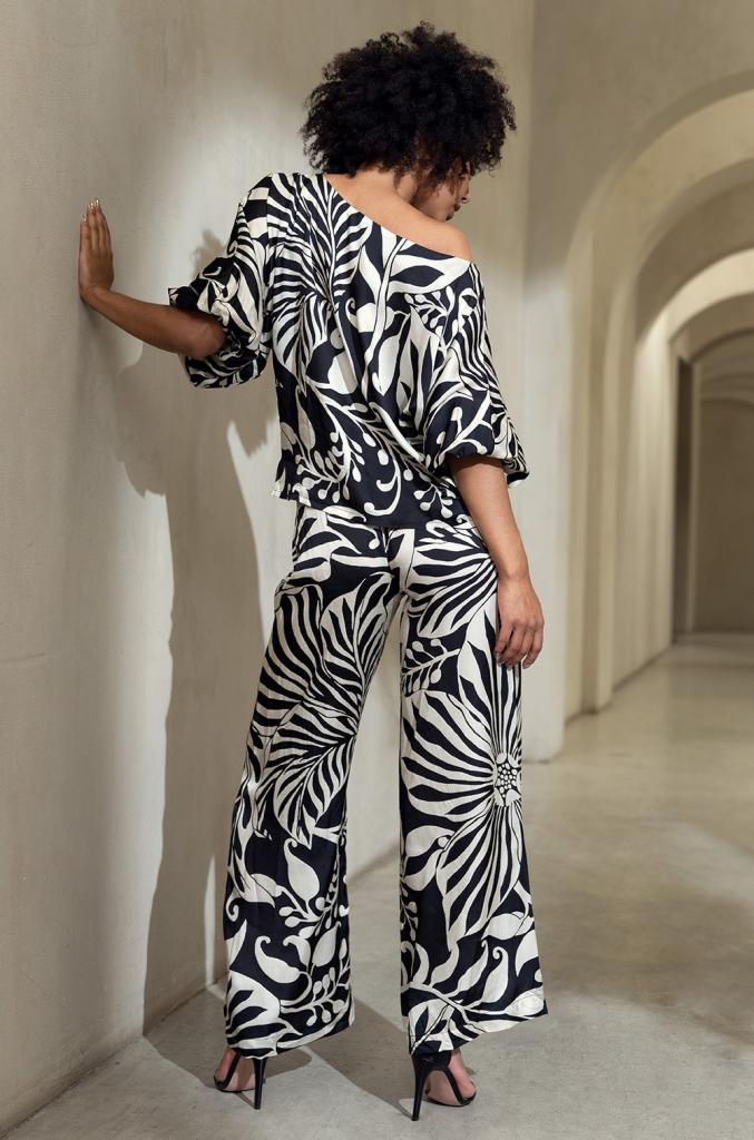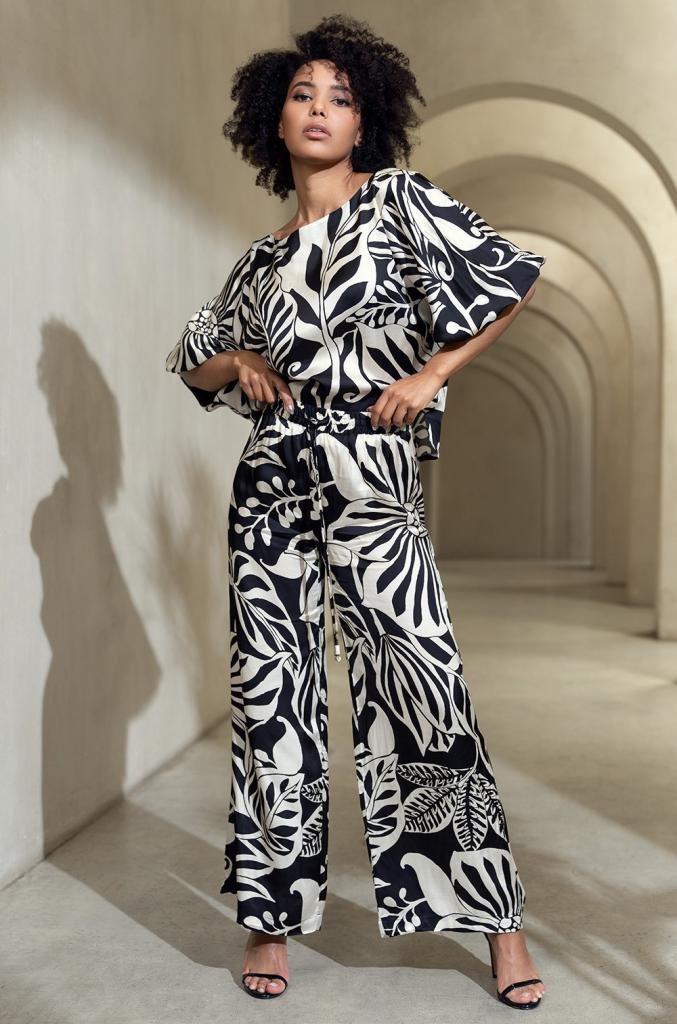 Комплект Mia-Amore состоит из свободного топа с рукавом длиной до локтя и широких брюк-палаццо. Изделия комплекта выполнены из принтованного смесового шелка. Низ рукавов собран на резину.