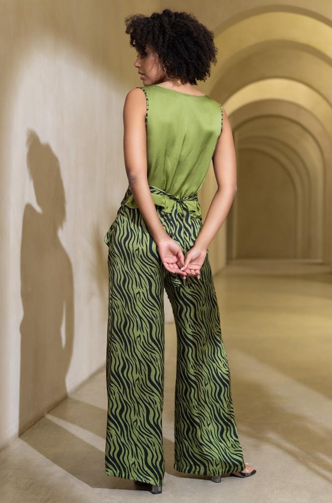 Комплект Mia-Amore состоит из топа с застежкой на пуговицы и широких брюк-полаццо. Топ выполнен из комбинации принтованного и однотонного смесового шелка, а брюки полностью из принтованного.