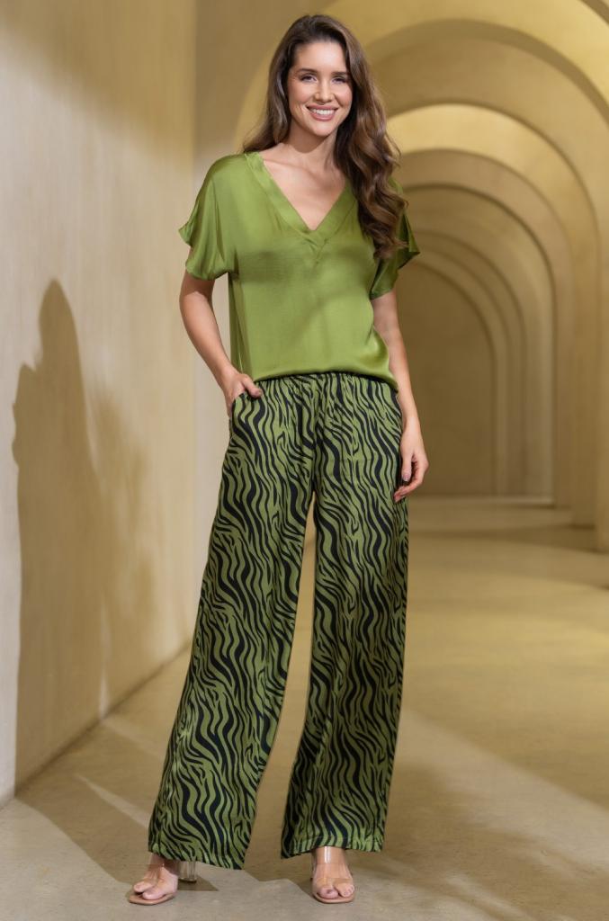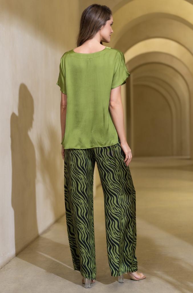 Комплект Mia-Amore состоит из однотонного топа свободного силуэта с коротким рукавом и широких принтованных брюк-палаццо. Изделия комплекта выполнены из смесового шелка.