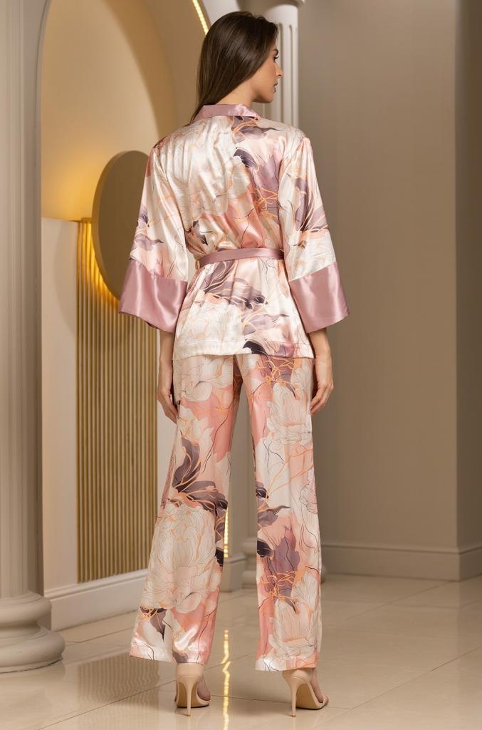 Комплект Mia-Amore выполнен из смесового шелка. Свободный жакет с застежкой на пуговицы и брюки из принтованного шёлка. Низ рукавов, воротник и пояс выполнены из однотонного шёлка. По талии жакет регулируется с помощью принтованного пояса. Брюки свободного силуэта выполнены из принтованного смесового шелка.