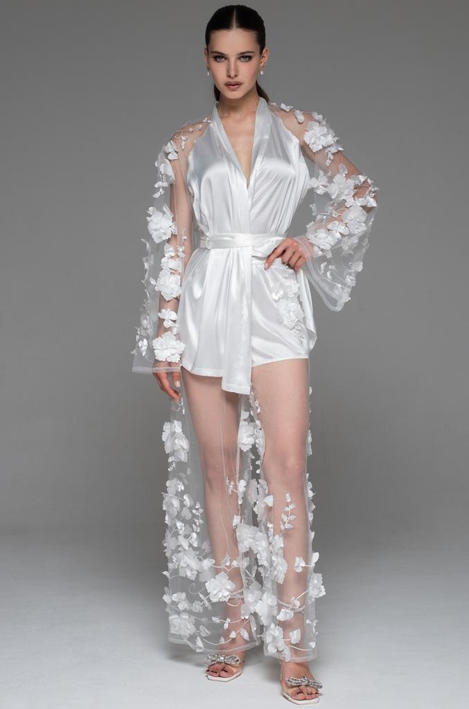 Комплект-двойка Mia-Amore состоит из шорт и запашного жакета. Комплект выполнен из смесового шёлка в сочетании с эффектной сеткой с цветами. Брюки полностью отшиты из сетки, но внутри есть короткая подкладка из смесового атласа. Запашной жакет выполнен из смесового шёлка, эффектные расширяющиеся к низу рукава из мягкой сетки с объёмными цветами.
