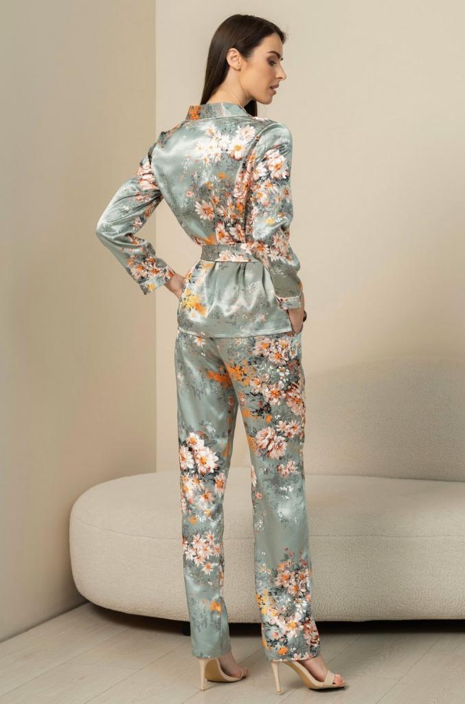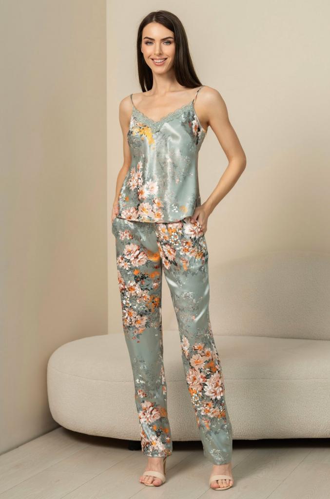 Комплект тройка Mia-Amore выполнен из смесовой шелковой принтованной ткани в нежных пастельных оттенках. Комплект состоит из топа на тонких бретелях, брюк и жакета с длинными рукавами и центральной застежкой на пуговицы. Верхний край топа оформлен кружевом, жакет по рукавам, борту и кармашек на груди украшен лиловым кантиком.