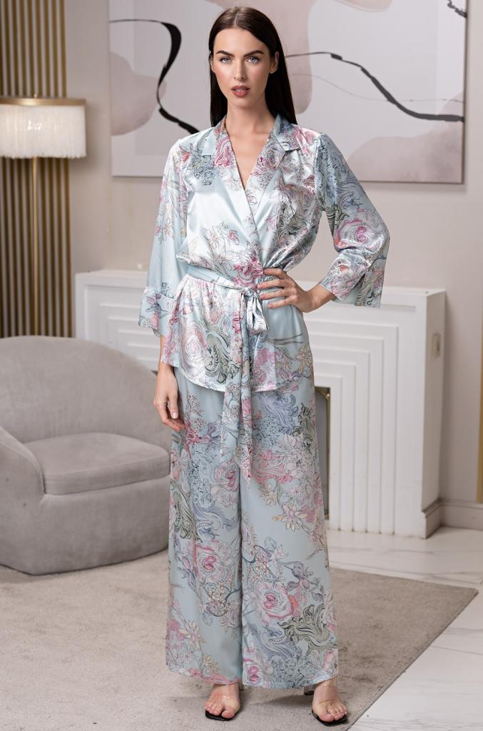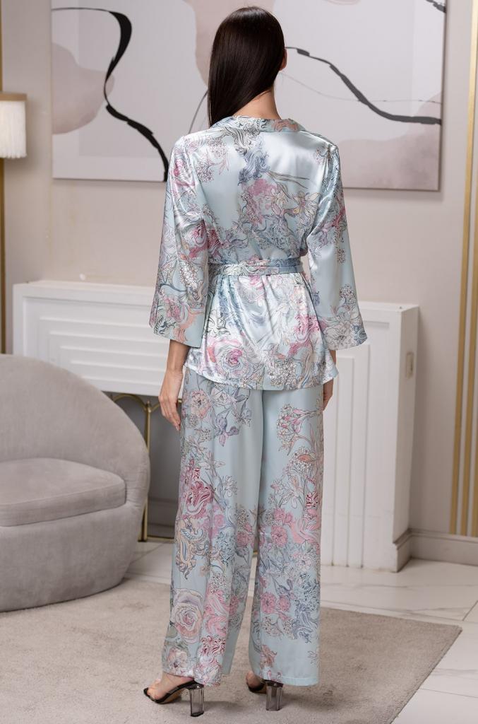 Комплект-двойка Mia-Amore состоит из жакета и широких брюк. Изделия комплекта выполнены из принтованного смесового шелка. Линию талии можно подчеркнуть за счет широкого пояса, который идет в комплекте.