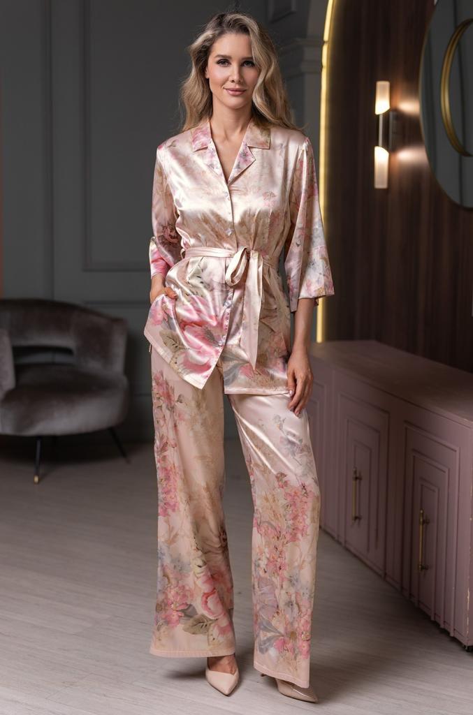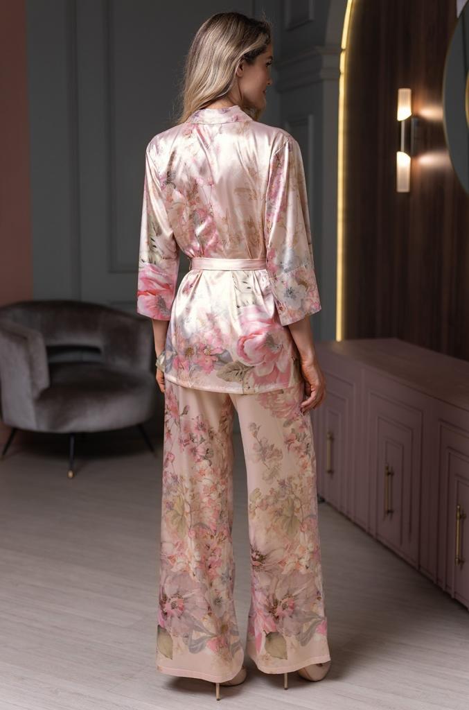 Комплект Mia-Amore выполнен из смесового принтованного шёлка. Комплект состоит широких брюк с карманами и жакета с центральной застежкой на пуговицы, который завязывается на талии съёмным поясом.