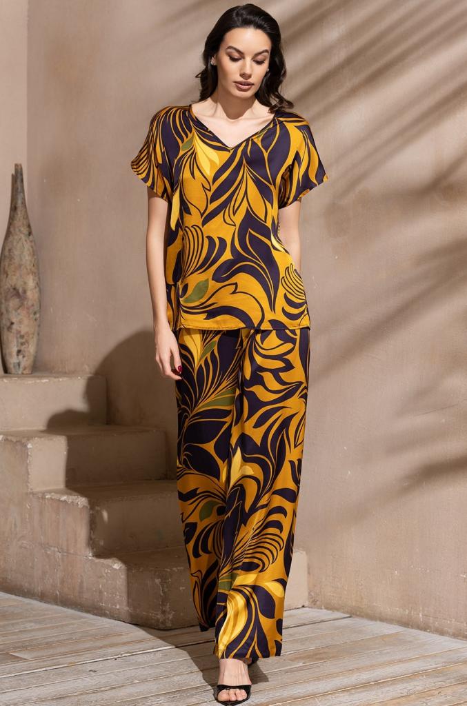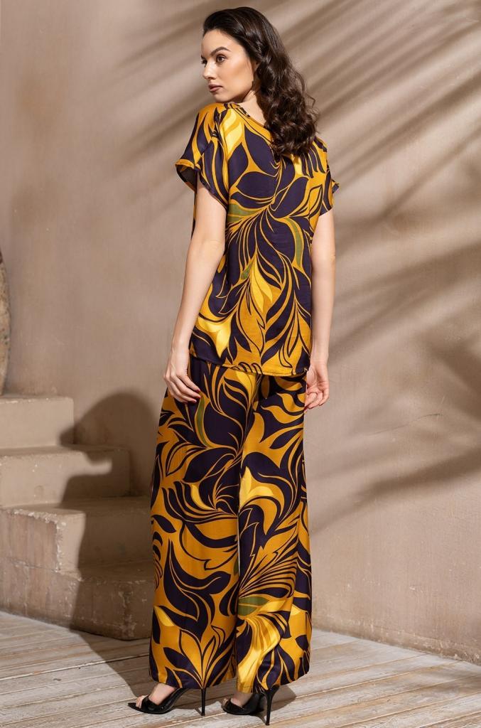 Комплект Mia-Amore состоит из топа свободного силуэта с коротким рукавом и широких брюк-палаццо. Изделия комплекта выполнены из принтованного смесового шелка.